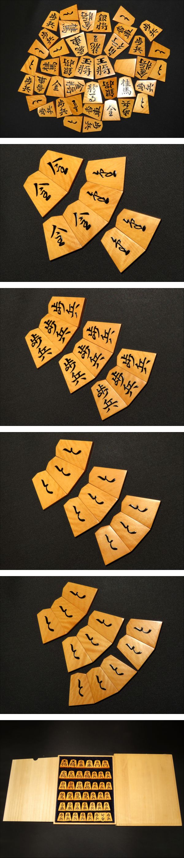 木地は御蔵島黄楊虎斑。ご覧の通り味の良い木地です。全ての駒の表裏をUPしてございます。是非ご覧下さい。
