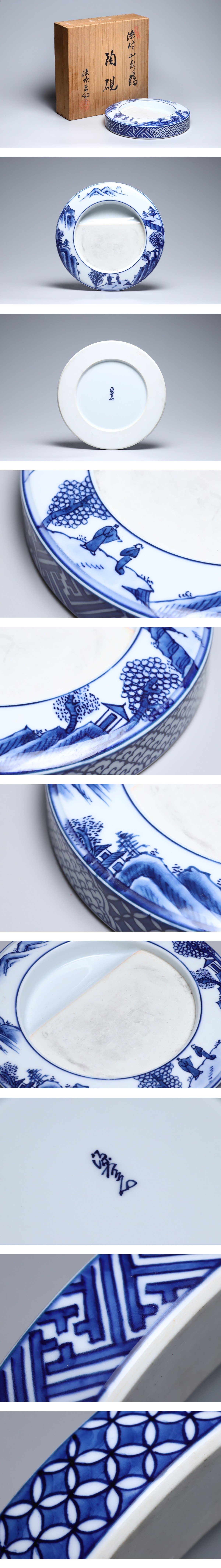 書道具 陶硯 源右衛門窯 染付山水紋 円型 共箱 在銘 硯 文房具 書/書道/古美術/骨董品 L07769 收藏