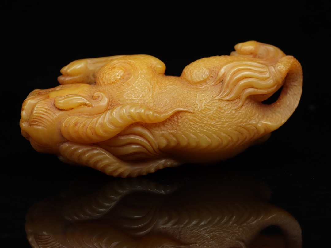 ◆御泓軒◆『金石篆刻 白石銘 寿山田黄石彫 瑞獣紋彫り件 共箱』極細工・古賞物・中国古玩・中国古美術