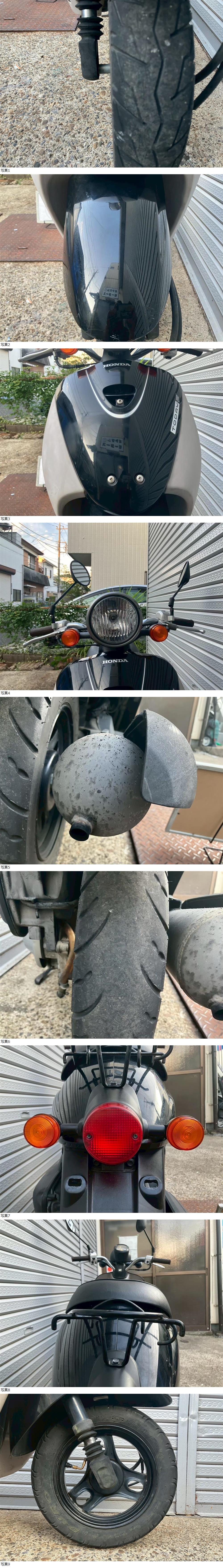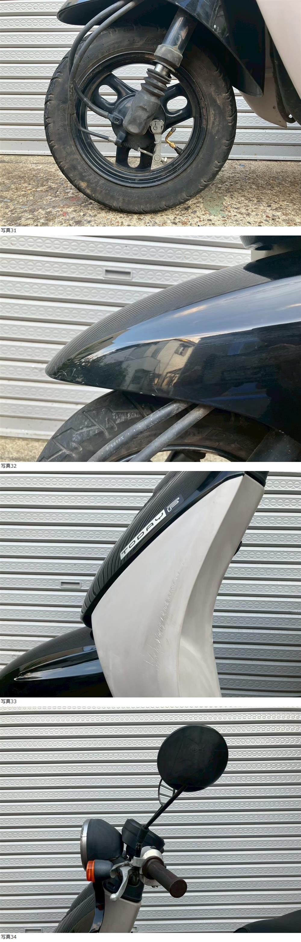 | 商品説明 | この度は当出品車両をご覧頂きまして誠に有難う御座います。 他にも複数台出品がございますので宜しければご覧ください! ご入札頂けた際には文末にありますお取引詳細にご同意頂けたものとさせて頂きます。 下記車両詳細・お取引詳細になりますので必ずご一読くださいませ! また、直接お越しいただいた方にその場で販売することもあるため予告なしに出品の取り消し等をする場合も御座います。 よって、落札前には一言コメント欄にてご一報頂けますと幸いです。予めご了承下さい。 〜〜車両詳細〜〜 メーカー:ホンダ 車種:Today-F 年式:2009年 色:黒 鍵:純正キー1本 排気量:50cc 走行距離:18,054km 燃料供給装置:インジェクション フレームNo:AF67-1221XXX 自賠責:なし 自賠責の加入も可能です! トゥデイからインジェクションモデル&ツートンカラーのトゥデイF入荷☆ ・外観 全体的に年式なりの傷やよごれあどありますので 状態は写真にてご確認ください。 リアフェンダ一部カットされております。 ・エンジンセルにて始動O K! 吹け上がり良好! 確認箇所は以下となります。 スピードメーター:作動OK! ヘッドライト:ハイロー点灯! ウィンカー:前後左右点灯! テール:尾灯・ブレーキ共に点灯! ナンバー灯:点灯! ホーン:作動OK! ★別途部品交換受け付けます! ・タイヤ前後交換など!詳細は直接お問い合わせくださいませ! エンジンオイル・タイヤ交換など! 詳細は直接お問い合わせくださいませ! *上記ご利用の際は部品の在庫状況によりお引き渡しまでにお時間を頂戴する場合が御座います。 〜〜お取引詳細〜〜 ※ご注意ください※ 出品車両はあくまで現状販売となります。走行点検などは行っておりません。 良好・好印象などの表記に関しても車両の状態を確実に保証するものではなく 細かい程度の差なども含めあくまで当方の主観でありますこと重々ご承知置き下さい。 特別に気になる箇所など(外観に限ります)がある場合は直接ご相談ください。 ご指定いただきました箇所のお写真を添付をさせていただきます。 (あまりにも多い場合はご対応致しかねます。) 上記を踏まえまして現車の確認は大歓迎です。 細かい箇所など気になる方は是非とも現車確認を行ってください! (予約制となりますので直接お問い合わせください。) 一般の二輪販売店と同様の点検・整備は行っておりません。 車両に関する一切の保証等も御座いませんので自走でのお引き取りはお断り致します。 ある程度の知識があり落札後にご自身で整備の出来る方、或いは整備工場等にて分解整備を別途検討できる方、メンテナンスベースとしての使用などの落札を推奨しております。 明記してあること以外の確認はしておらず、また致しかねます。 目視できる消耗品以外のパーツに関しましても寿命のわからぬものなど御座います。 (中古品ですのでつい先程まで正常に作動していたにも関わらずお受け取りの際に状態の変化などある場合も十分御座います。例・電子機器、ワイヤー類など) 再三にはなりますが如何なる場合もお引き渡し後のキャンセル・クレームはお受け致しかねます。 現状販売というものを重々ご理解の上ノークレーム・ノーリターンでよろしくお願い致します。 原則キャンセルはお受け致しかねますが、止むを得ず落札者様都合でキャンセルされる場合には 落札金額の1割をキャンセル費用として頂戴させて頂きます。 上記取引内容に不安を感じられる方には二輪販売店等の整備・保証付き車両のご購入を強くお勧め致します。 ★直接引き取り・即引き取り大歓迎! 直接引き取りの場合、落札から1週間以内にお引き取り下さい。 それ以降日割りにて2,200円を別途頂戴させて頂きます。 *部品交換をご依頼の方は完成のご連絡から1週間以内となります。 ★配送OK! 主に配送業者に委託しております。ご自身で手配いただいても結構です。 レッドラインの金額を参考にしておりますのでお手数ですが費用に関しましては落札者様にて直接HPでご確認下さい。 発送元は埼玉県川口市となります。ご購入から配送までの目安は関東近郊で1〜2週間程度となるかと思います。(地域、期間により大幅に異なりますので納期が気になる方は直接レッドラインへお問い合わせ下さい。) 関東近郊の場合割増でお早めにお届けできる場合も御座いますので一度ご相談下さいませ!(対象外となる場合も御座います。) また、配送の場合もお取置き等の対応は致しかねますので落札後は速やかに配送依頼の手続きを行わせて頂きます。 ★車両のみの販売となりますので必要な場合のみ別途5,500円にて販売証明書の発行・発送を受け賜ります! ★新規アカウントの方、落札者様の評価内容によりましては、ご入札頂いても当方の判断で削除する場合がございます。予めご了承下さい。 ★落札後、24時間以内にお客様情報のご入力・落札代金のお支払いがいただけない方のお取引はキャンセルとさせていただきます。(お支払いに関しましては、どうしてもの場合大