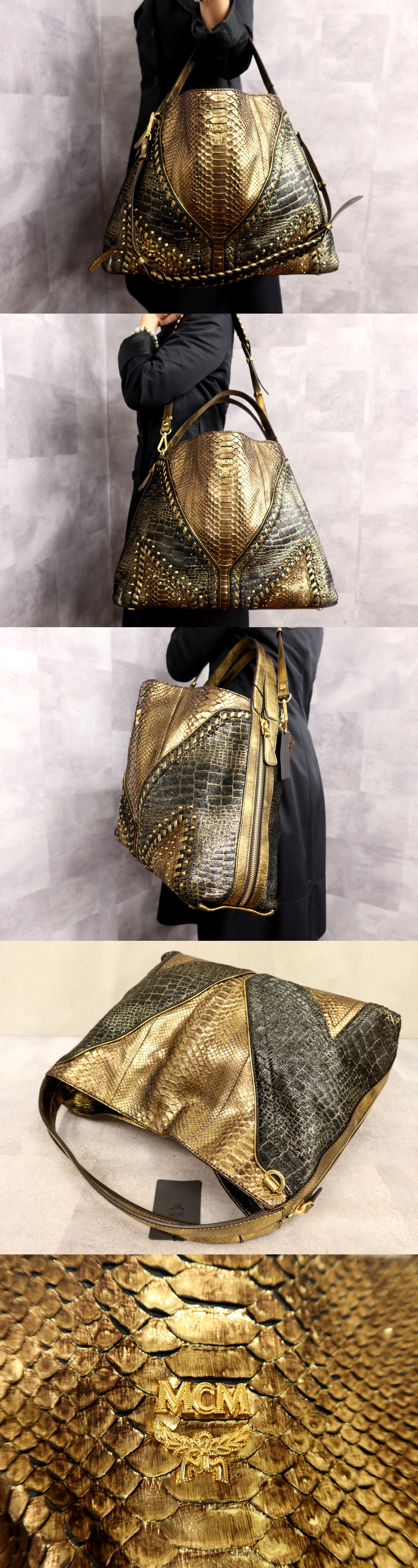●超美品●MCM エムシーエム●ロゴ金具●ハラコ パイソン 本 ヘビ 革●2way ハンド バッグ●ゴールド●ゴールド金具●A4 収納●Js62478 收藏