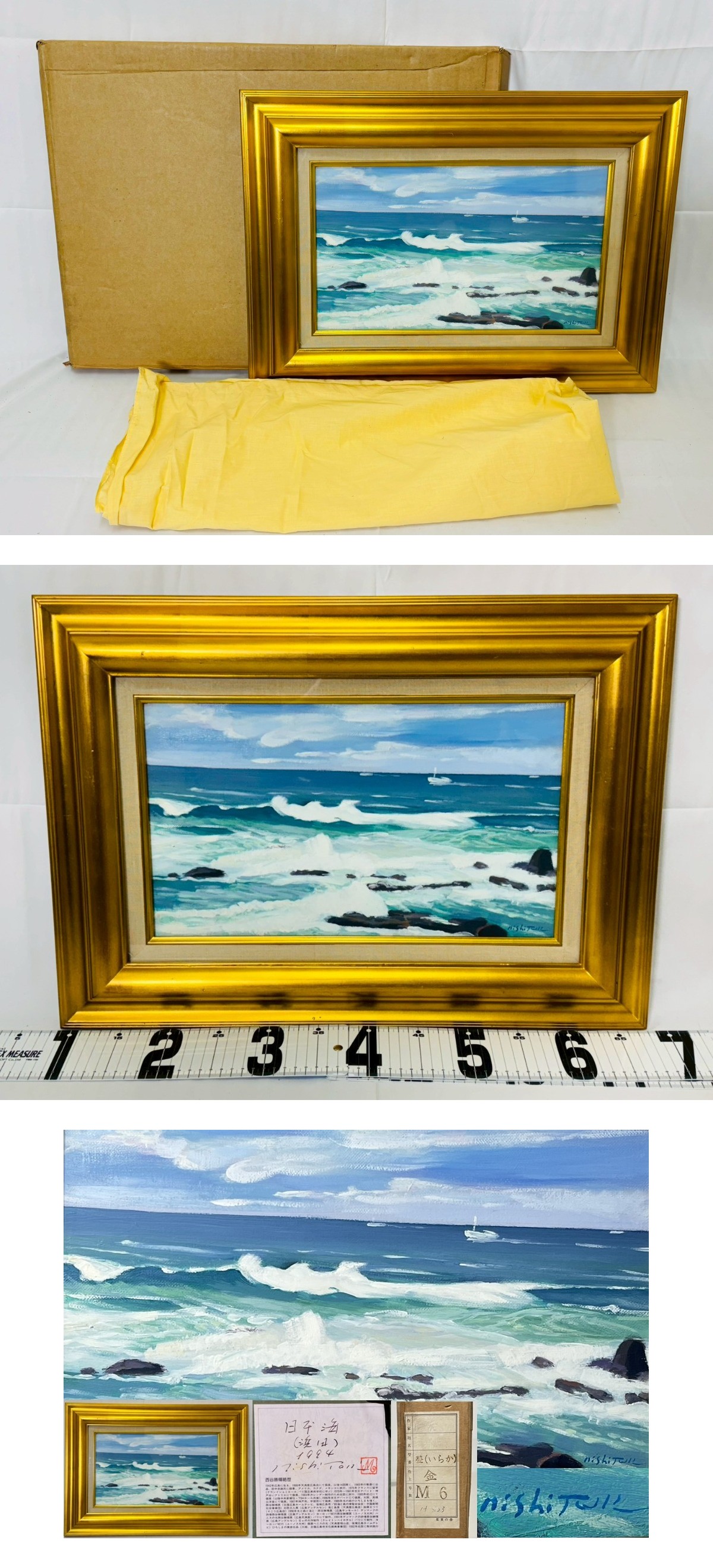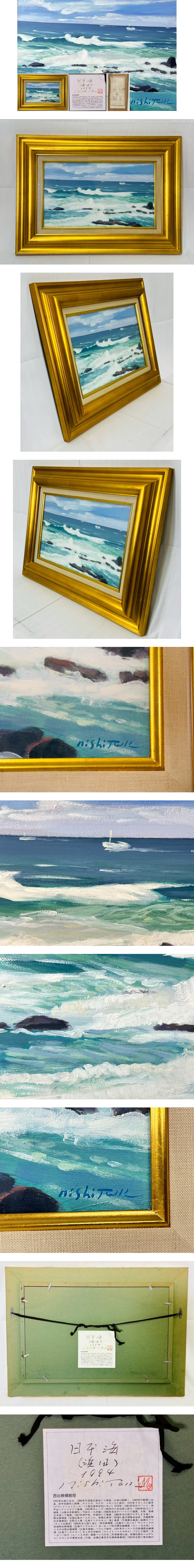 【真作】西谷勝輝「日本海(海景)」1984年 油彩 額装 直筆サイン有り 肉筆 海岸風景 金縁額付 海の絵 美術品 インテリア コレクター放出 收藏