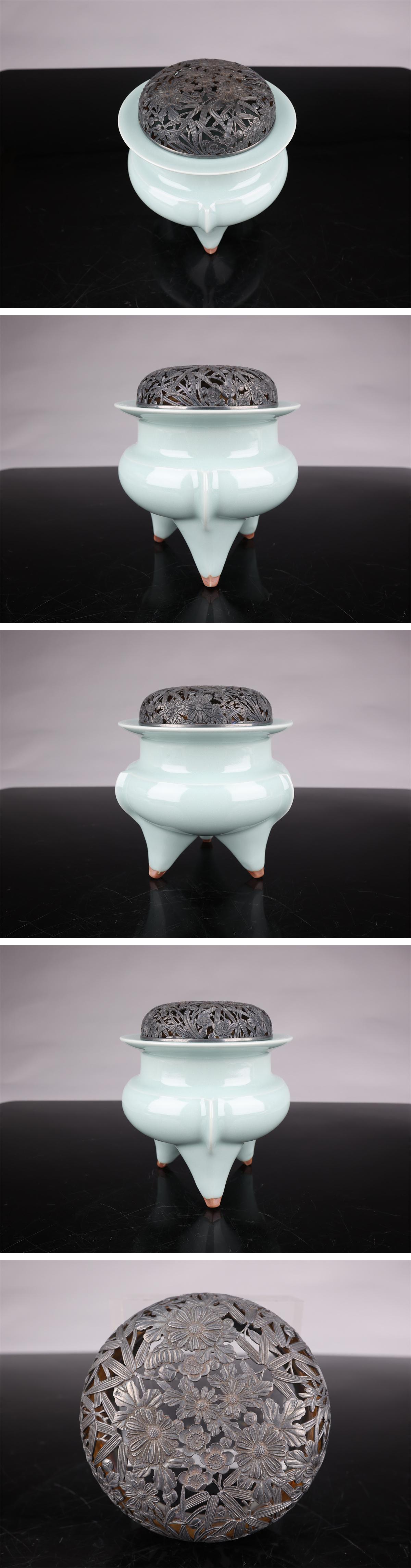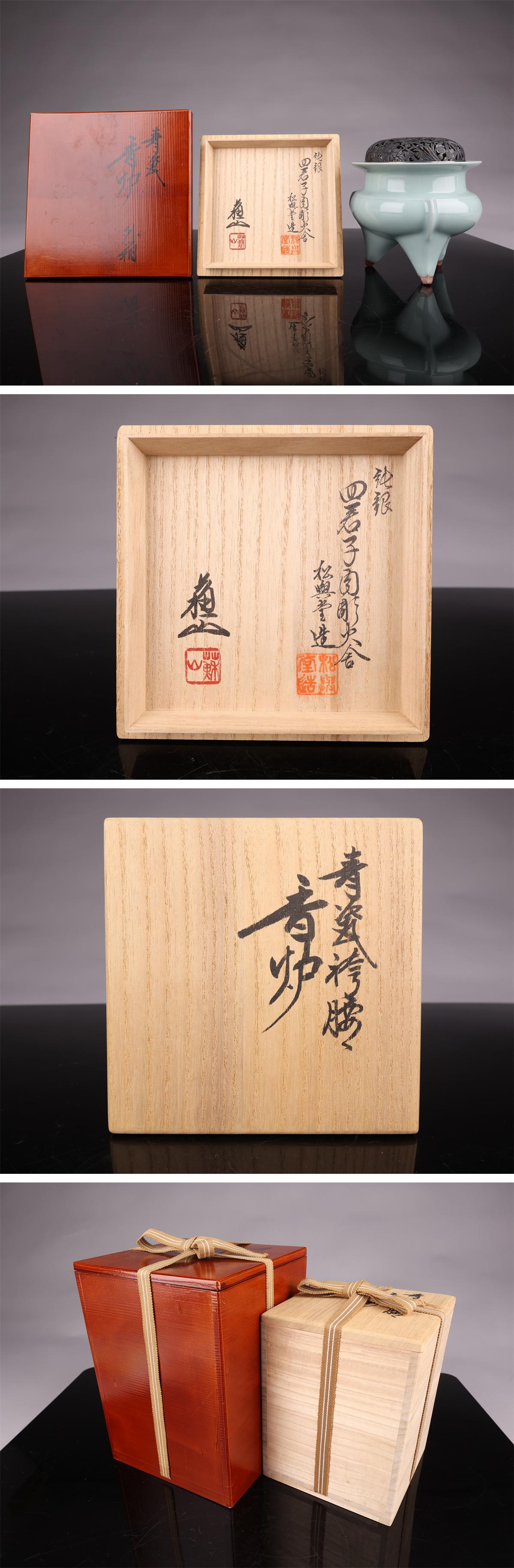 【志】A731香炉 三代 諏訪蘇山 純銀火舎 四君子(松興堂造)青磁袴腰香炉 重量113g 香道具 二重箱*= 收藏