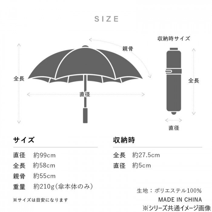 | サイズ | 直径:約99cm、全長:約58cm、親骨:55cm、収納時:H27.5×W5cm(直経) 個装サイズ:28.8×5.8×4.9cm |