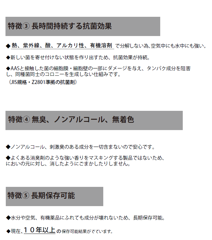 | 成分内容 | ピクアナイド系・ジョードメチルトリルスルフォン ピグアナイド系の安定薬剤を主成分にした複合物で組成されている複合材なので、他の除菌剤と異なり耐性菌の発生を長期間抑制する事ができます。 |