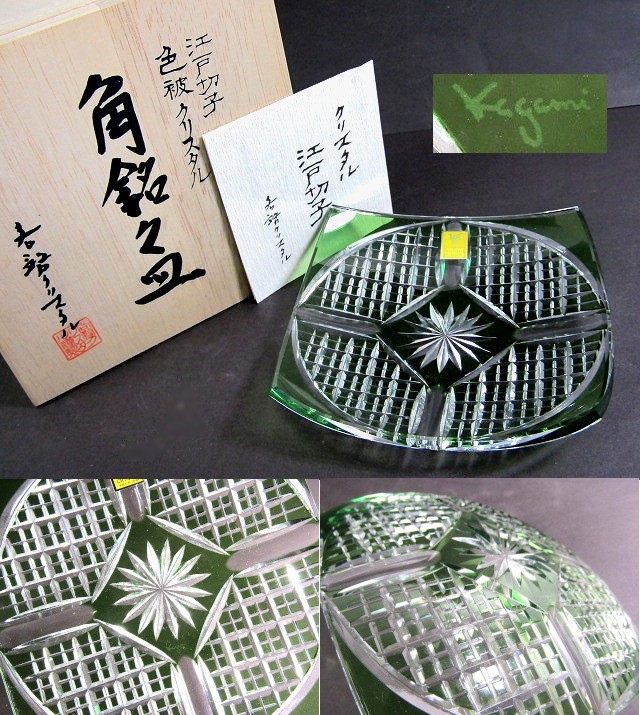 美品 カガミクリスタル 江戸切子 色被クリスタル 角銘々皿 共箱【説明欄に詳細写真有り】の出品です。