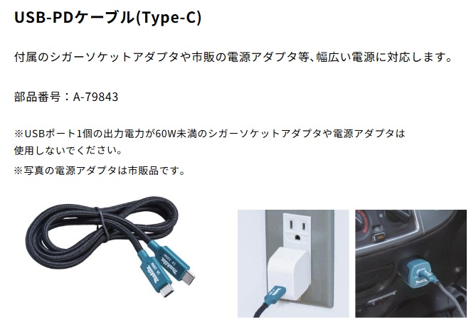 マキタ makitaUSB-PDケーブル(Type-C)A-79843市販の電源アダプタ等、幅広い電源に対応します。※USBポート1個の出力電力が60W未満のシガーソケットアダプタや電源アダプタは使用しないでください。197050372772