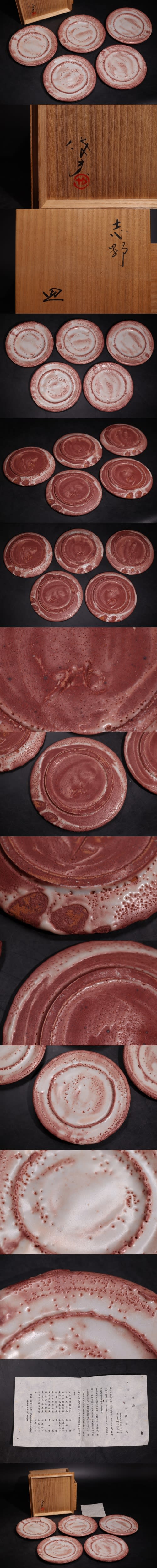 | 玉置保夫 作 志野 皿 五客 共箱付 / 茶器 煎茶道具 銘々皿 煎茶飾 .G4163 |