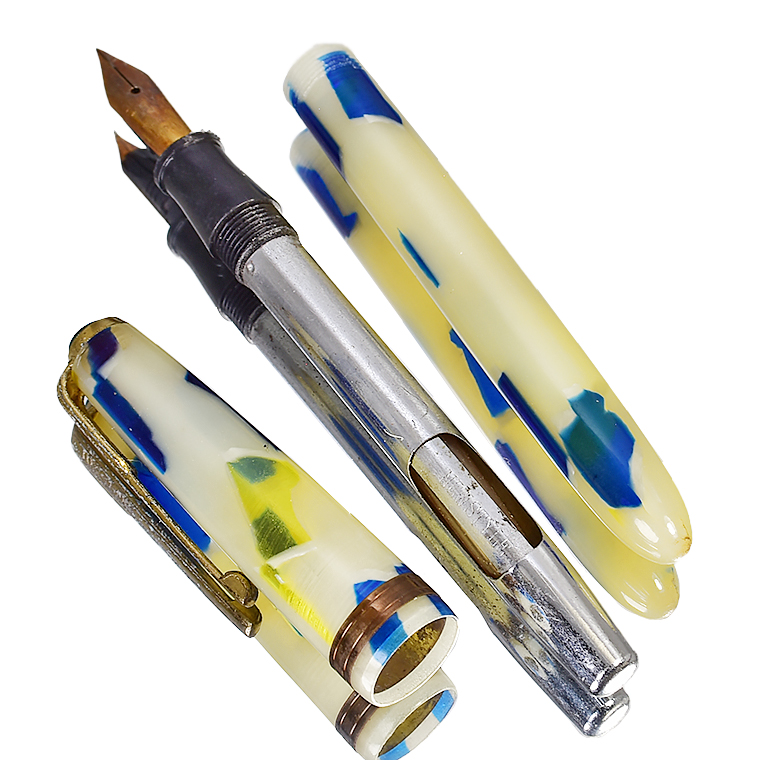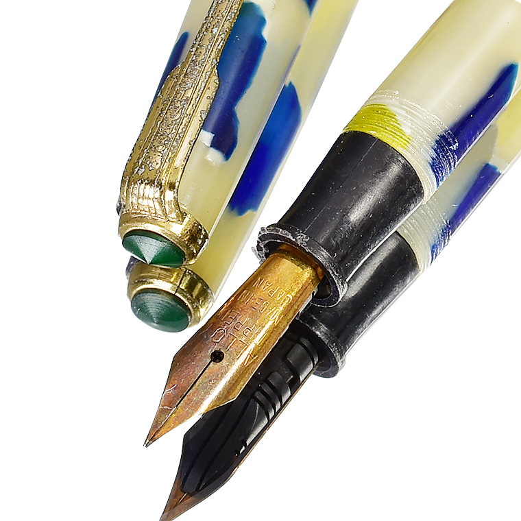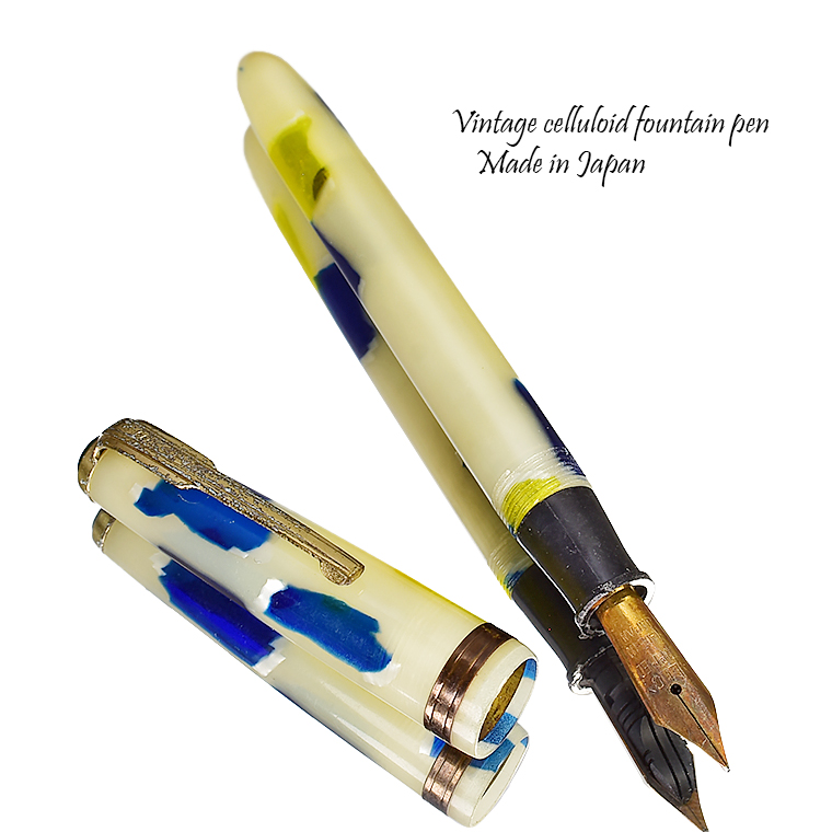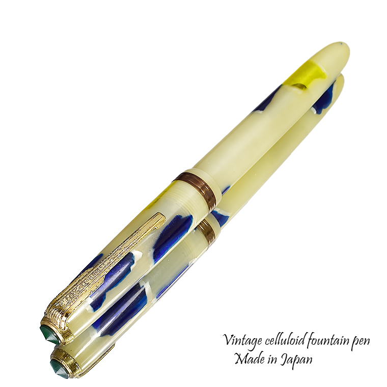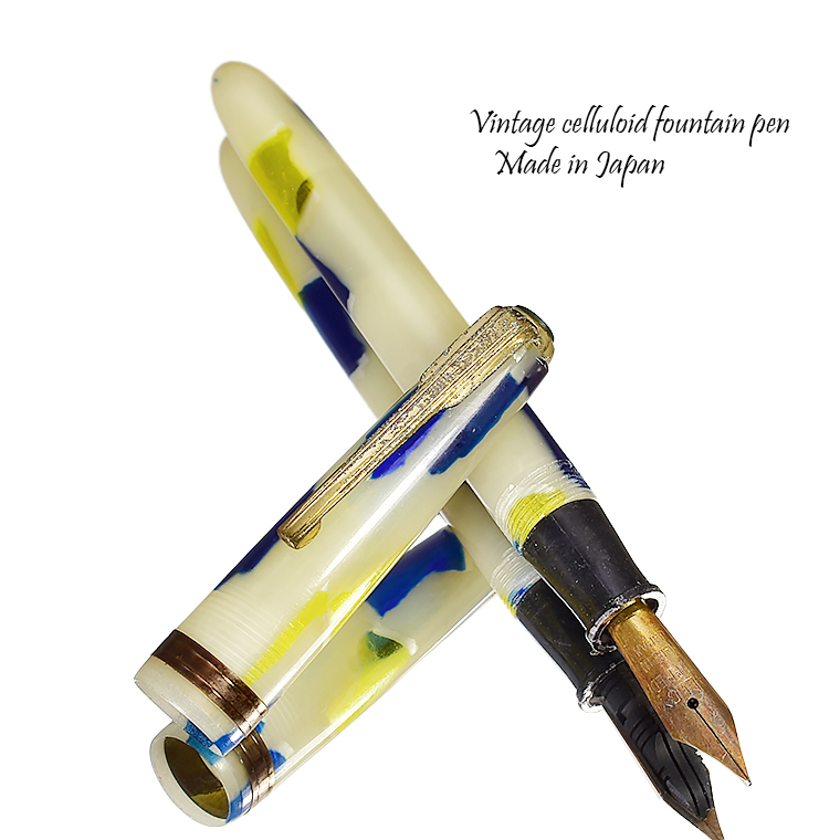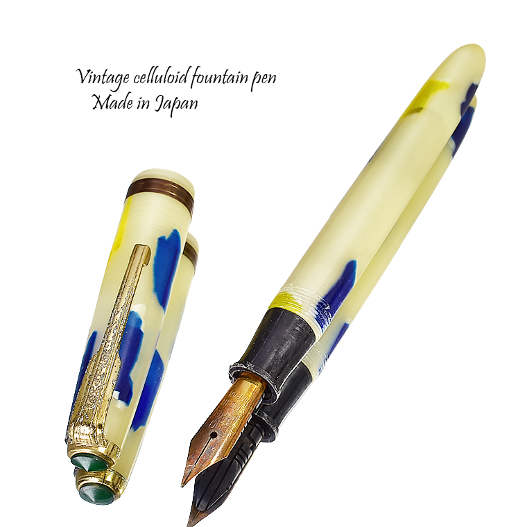 ■●ビンテージ セルロイド万年筆 職人が再生 希少な逸品 ブルー×イエロー モザイク ペン先 EF 極細 中押し式 レトロ 調整済 1円~/M543kk 收藏
