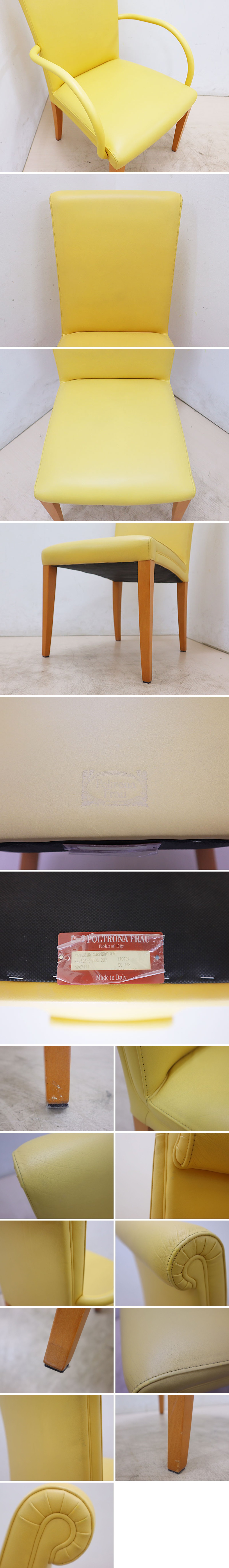 デザイナー:Poltrona Frau Style & Design Centre(ポルトローナ・フラウ スタイル&デザインセンター) サイズ:アームレスチェア/約 W46×D60×H86・SH43cm、アームチェア/約 W51×D60×H86・AH63 SH43cm ※実寸の為、多少の誤差はご了承ください。 張地:レザー 脚部:ビーチ材 張地カラー:イエロー系(画像は100%正確では御座いませんので気になるお客様は世田谷区船橋の倉庫でご覧頂けます。色味による返品、返金は一切お受けできませんのでご了承の上、ご入札をお願い致します) |