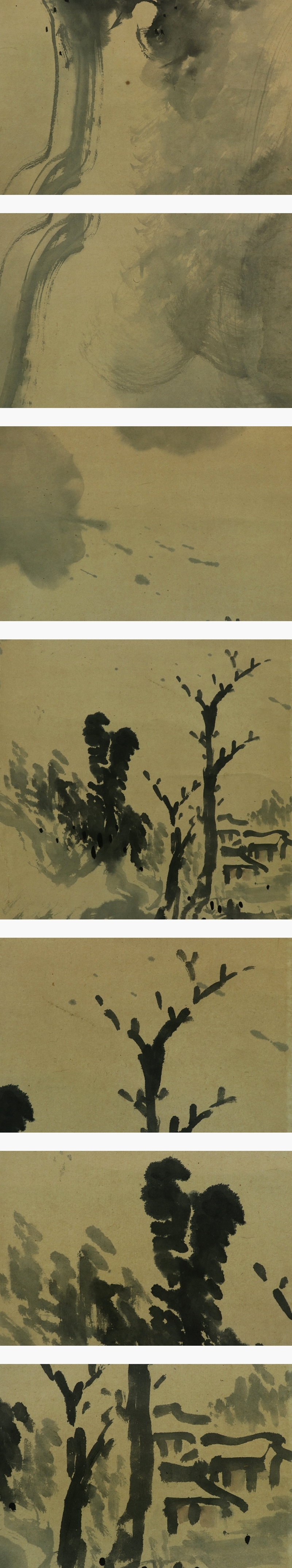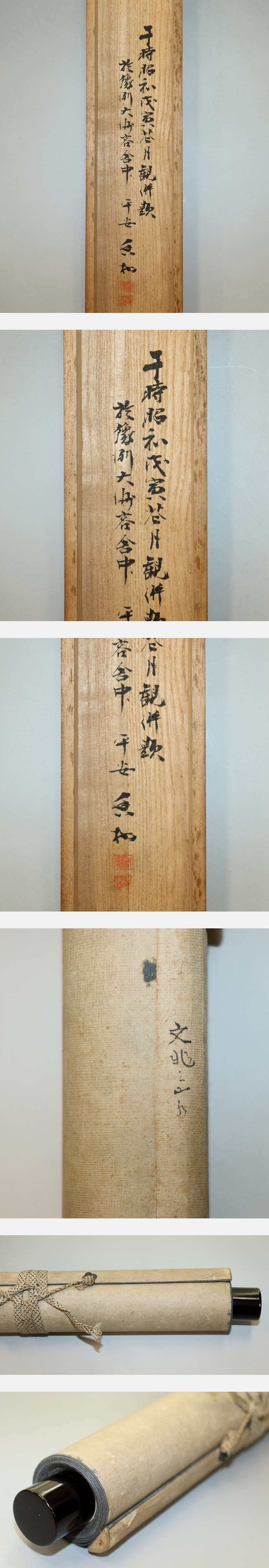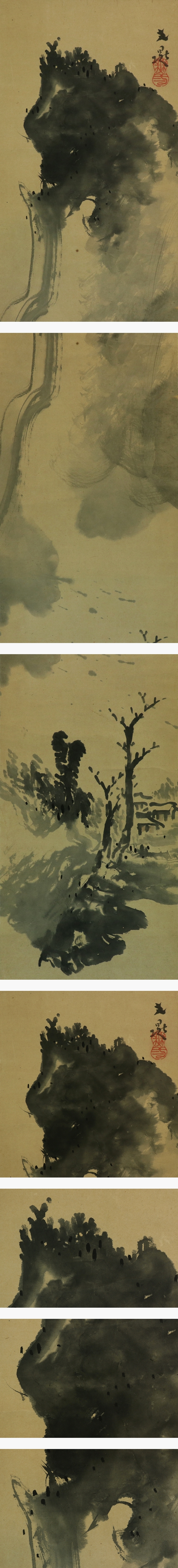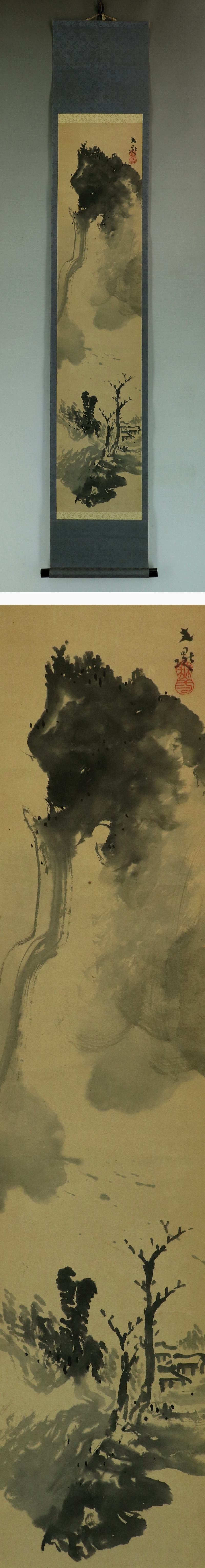 谷文晁 たに-ぶんちょう(1763-1841) 江戸時代後期の画家。 宝暦13年9月9日生まれ。谷麓谷の長男。加藤文麗,渡辺玄対らに師事。 狩野派,土佐派,南宗画,北宗画,西洋画などの手法を取り入れて独自の画風を創出, 江戸文人画壇の重鎮となる。田安徳川家に仕え,松平定信編「集古十種」の挿絵も描く。 渡辺崋山ら門人多数。天保11年12月14日死去。78歳。江戸出身。 通称は文五郎。別号に写山楼,画学斎など。 本紙は、染み、汚れ、折れ、皺、虫食い痕、ヤケ、擦れがあります。 表装は、染み、汚れ、軽い折れ、皺、虫食い、破れ、ほつれ、剥れがあります。 【サイズ】 作品 横約27.5cm×縦約125cm 表装 横約31.5cm×縦約178cm |