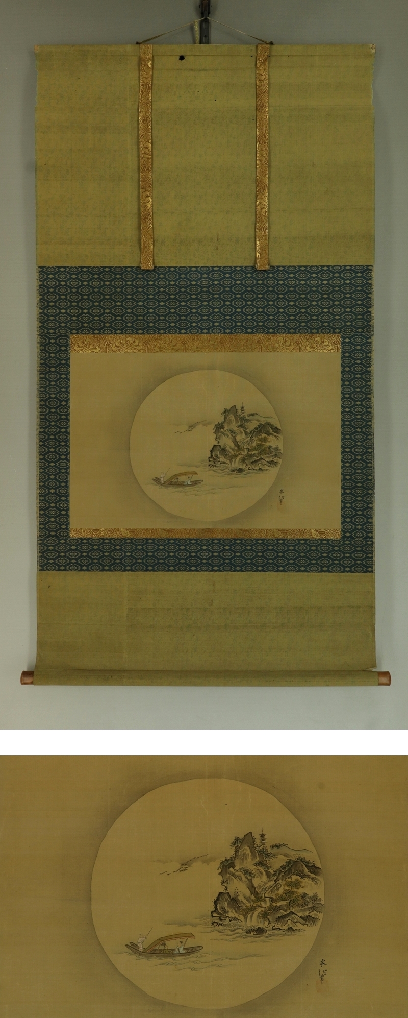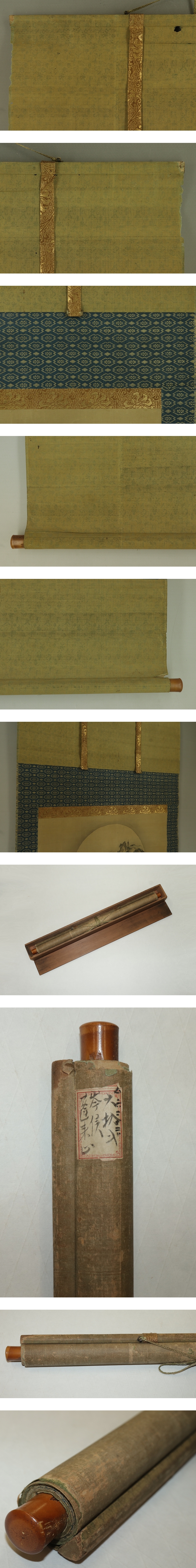 狩野岑信 かのう-みねのぶ(1662-1709) 江戸前期の狩野派の画家。 浜町狩野家の祖。常信の二男。幼名は吉之助、通称は主税、号は覚柳斎。 将軍家宣より寵遇を受ける。宝永5年(1708)歿、47才。 本紙は、染み、汚れ、折れ、皺、ヤケがあります。 表装は、染み、汚れ、折れ、皺、虫食い、破れ、ほつれ、剥れ、くすみ、 軸紐に劣化があります。 【サイズ】 作品 横約48.5cm×縦約32cm 表装 横約60.5cm×縦約115cm |