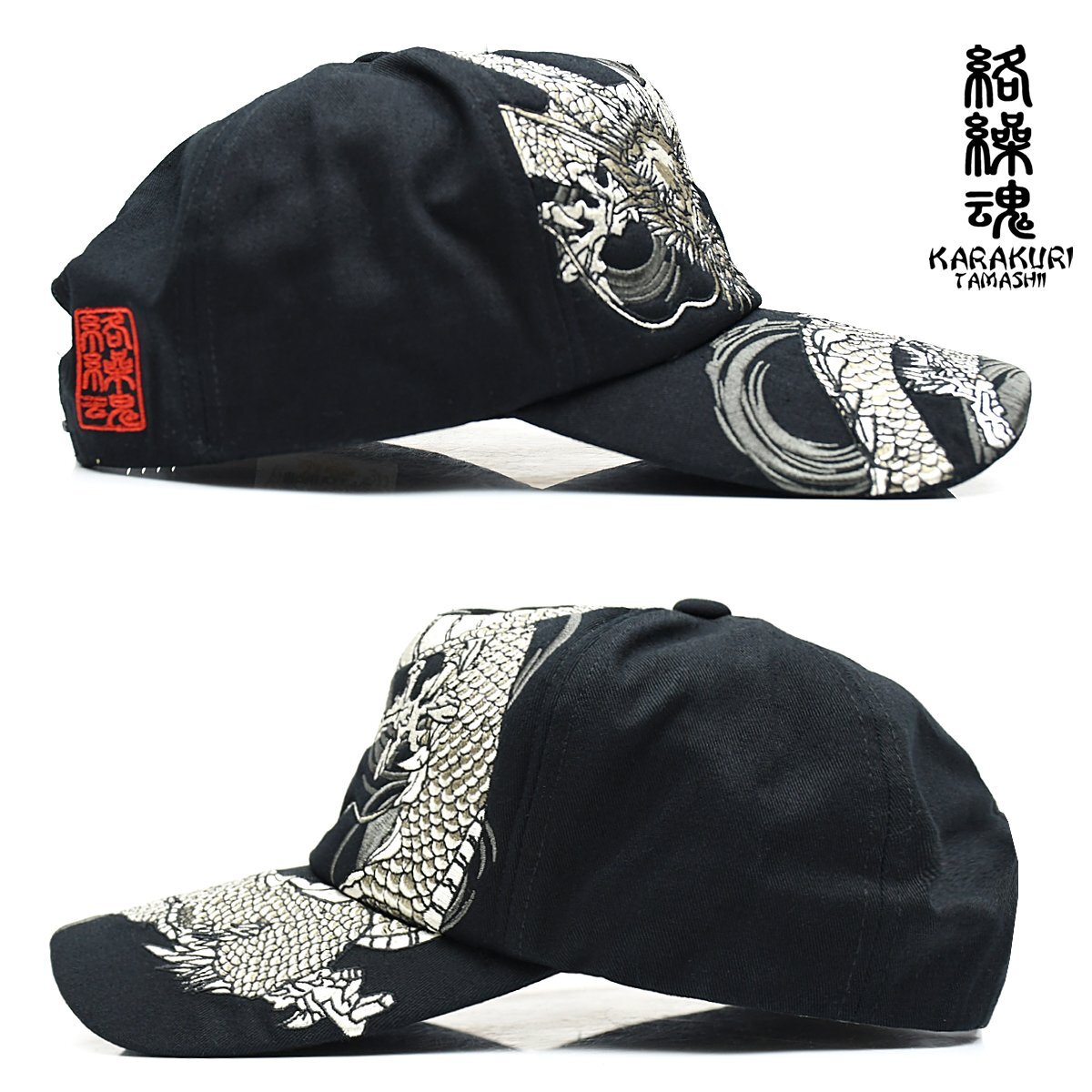 244896-25 絡繰魂 刺繍 和柄 帽子 ツイル キャップ メンズ(ブラック黒 龍) F 頭回り 58~62cm スナップバック ドラゴン 竜 收藏