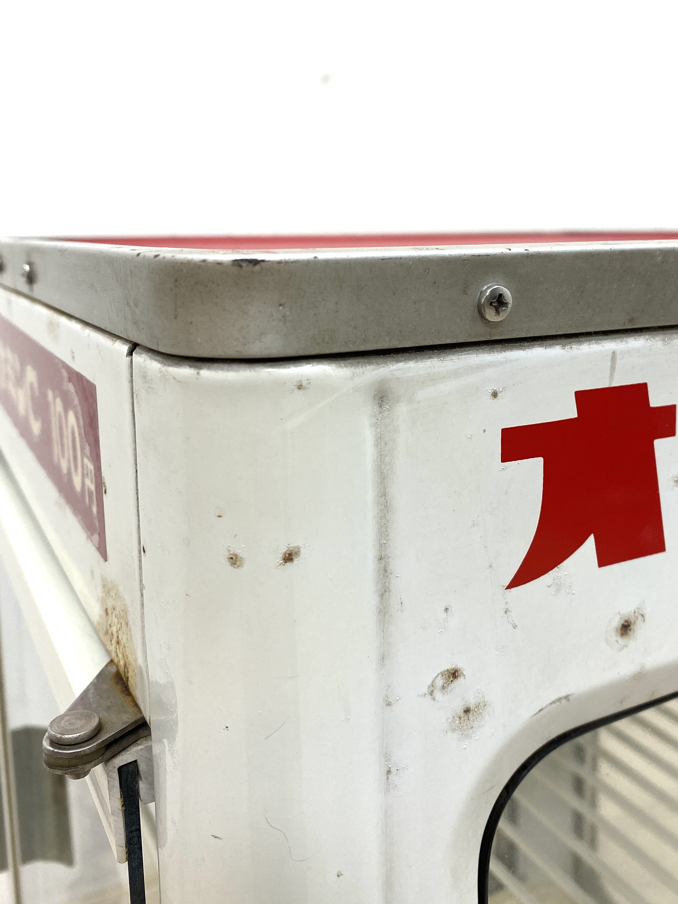 こちらは オロナミンCのロゴが描かれたミニキャビネット です。 中古品です。 「大塚製薬 オロナミンC」のロゴが懐かしい気分にさせてくれる一品です。 本来はサンヨー製の冷蔵ショーケースでしたが、残念ながら庫内は冷えませんでしたので、レトロなミニキャビネットとして出品します。 お気に入りの小物やレトログッズを飾ってお楽しみください。 コンパクトなサイズのため置き場所も選びません。ノスタルジーな雰囲気抜群のショーケースです。 【コンディションについて】 経年や使用によるキズや変色、パッキンの劣化があります。 使用感はありますが、昭和レトロな良い雰囲気のお品となっています。 また先に述べました通り、冷蔵庫としてはお使いいただけませんのでご注意ください。 他詳細については下記画像も併せてご参照ください。 ![]() ![]() ![]() ![]() ![]() この機会に是非ご検討ください。皆様のご入札をお待ちしております! 再良市場の他のお品物はこちらから! 【For those considering purchasing from overseas:】 This is a commercial refrigerator with the "Oronamin C" logo. It's vintage."Oronamine C" is a product of Otsuka Pharmaceutical. Unfortunately, It cannot be used as a refrigerator, so please use it as a cabinet. The size is 38 × 35 × 73cm.Weight is 23kg