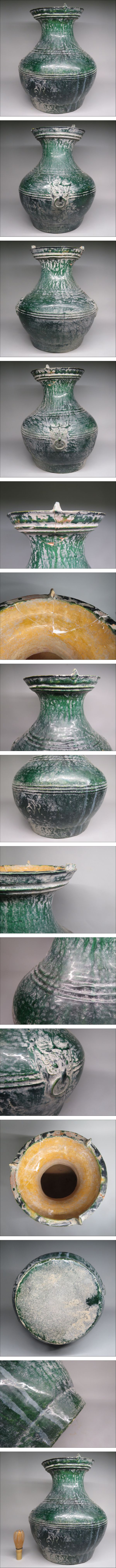 「都内コレクター所蔵品」漢時代 緑釉獣耳大壷 中国美術 東漢時代 ◆加彩 花瓶 発掘 彩文土器 彩陶壺 | ||