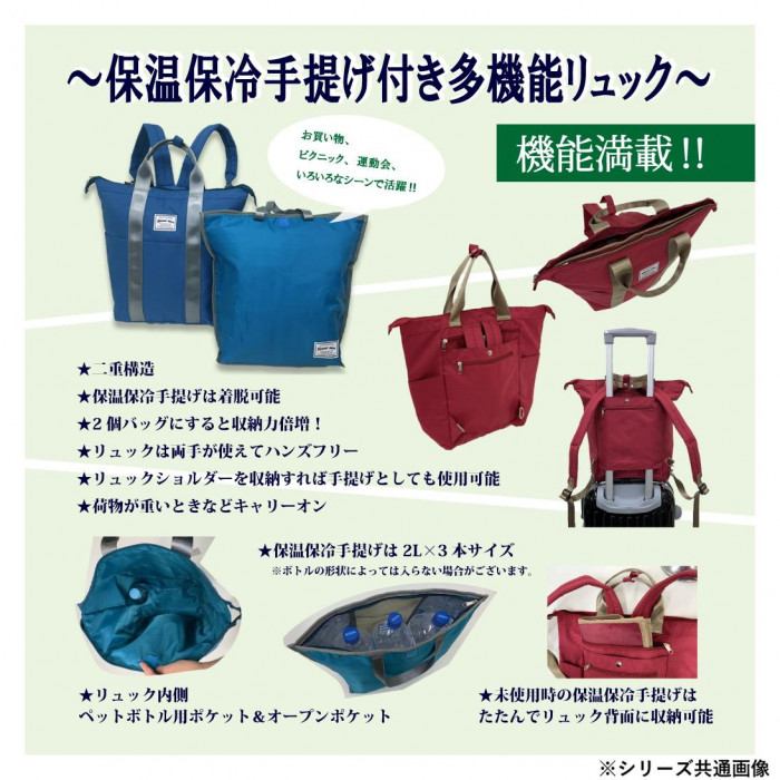 | 毎日のお買い物やレジャー・アウトドアに便利な機能満載のリュックです。リュック内側は、取り外し可能な保温保冷の手提げがついた二重構造。シーンに合わせて、外側のリュックと内側の保温保冷手提げを分けての使用も可能です。保温保冷手提げには、保冷材用のメッシュポケットがついています。リュック背面には保温保冷手提げを収納できるサイズのファスナーポケットやキャリーオン機能付き。 |