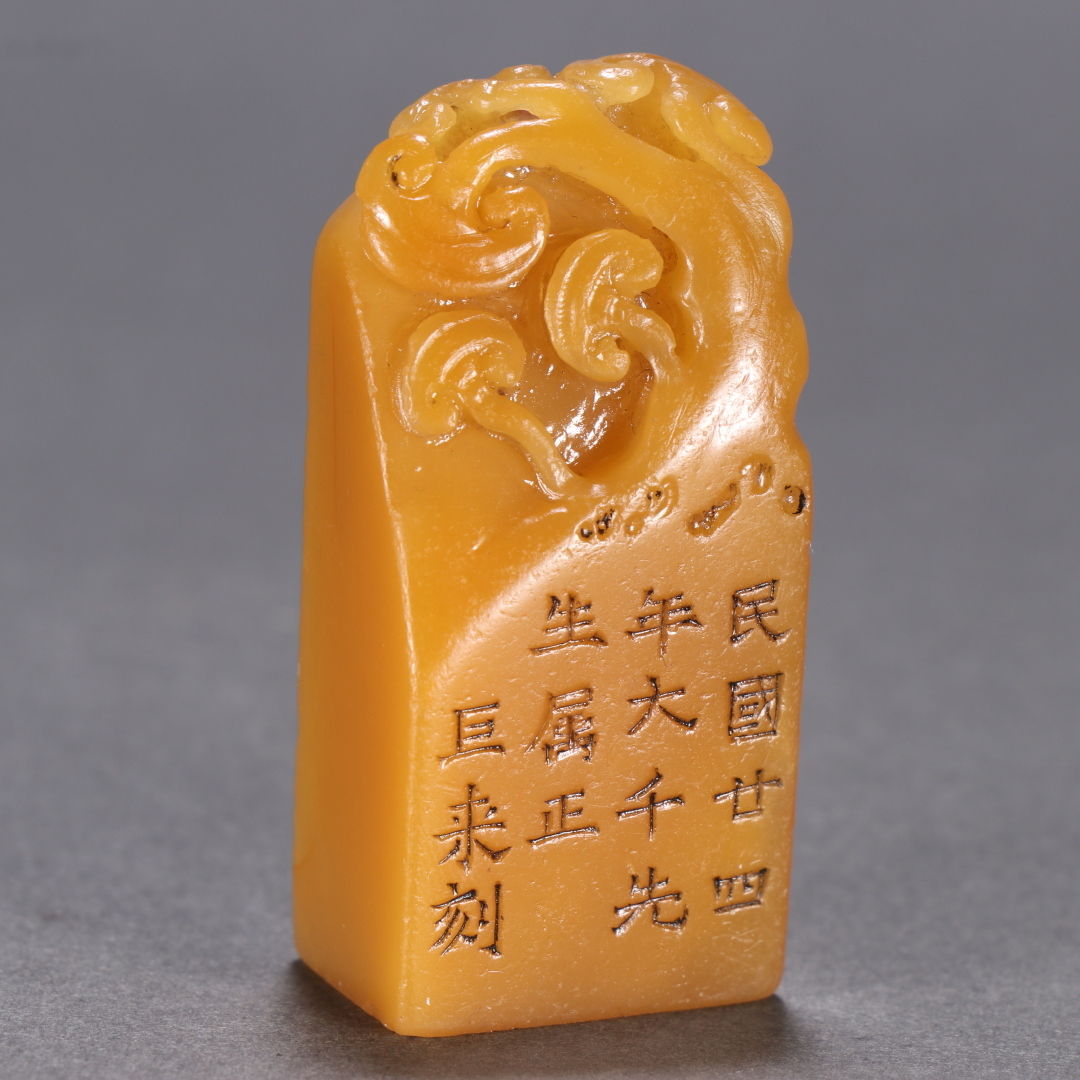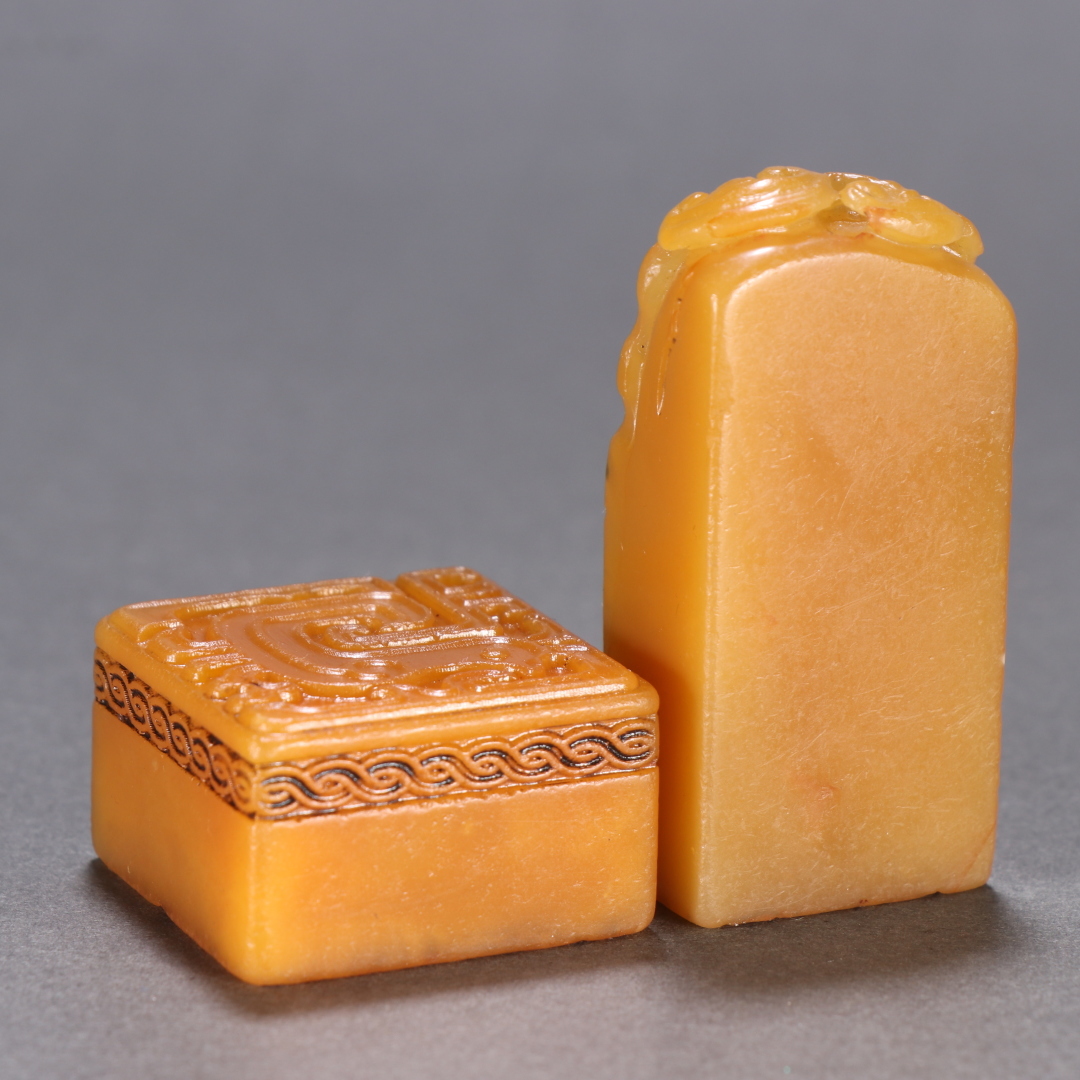 ◆御泓軒◆『民国朝時代 寿山石 田黄石彫 印章一対 巨来作 時代木箱付き』極細工・古賞物・中国古玩・中国古美術 收藏