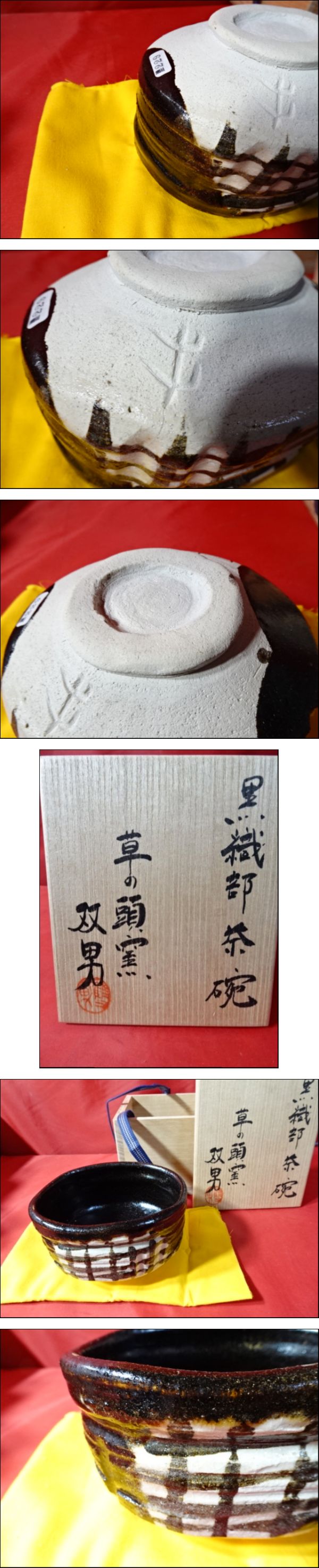 QG-38/草の頭窯 青山双渓(双男) 黒織部茶碗 茶道具 共箱 煎茶道具 父 青山禮三 現代陶芸作家 美濃焼 茶室床飾 陶芸品 ウコン布付 未使用 收藏