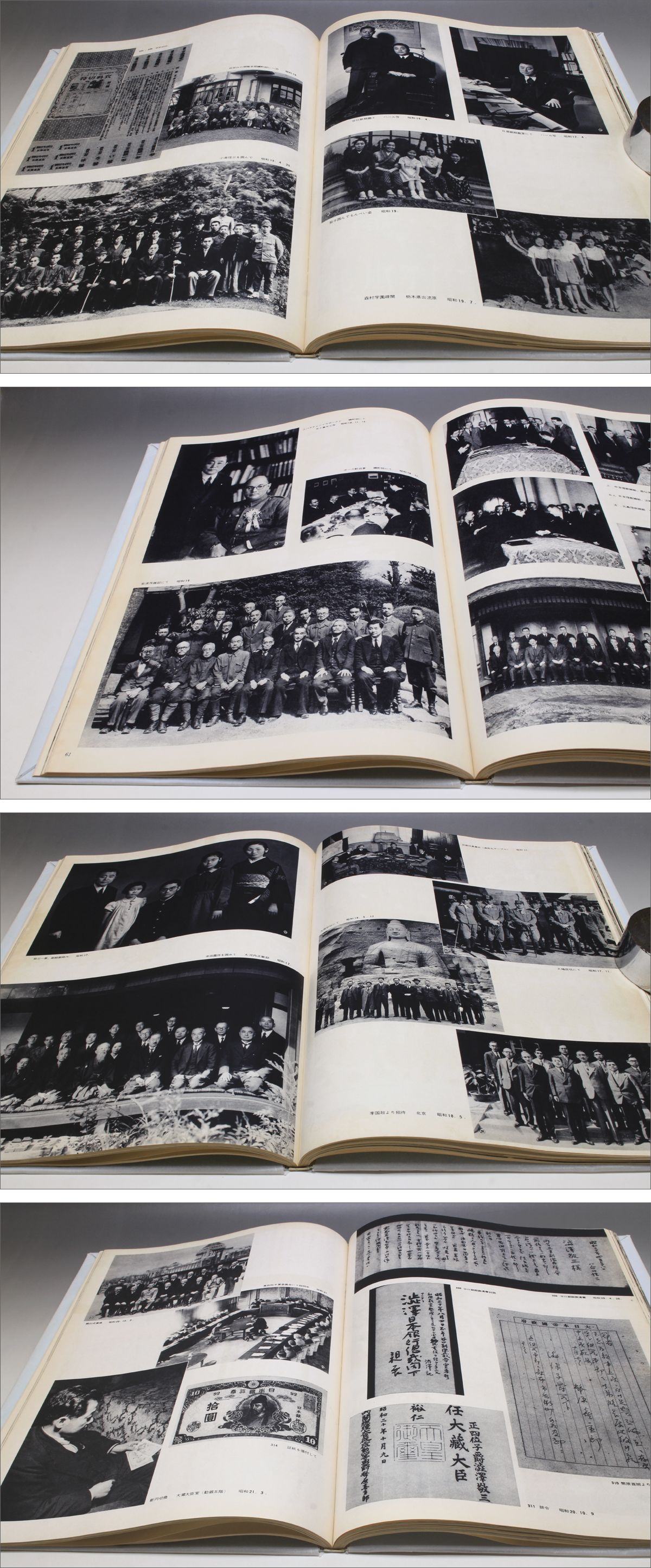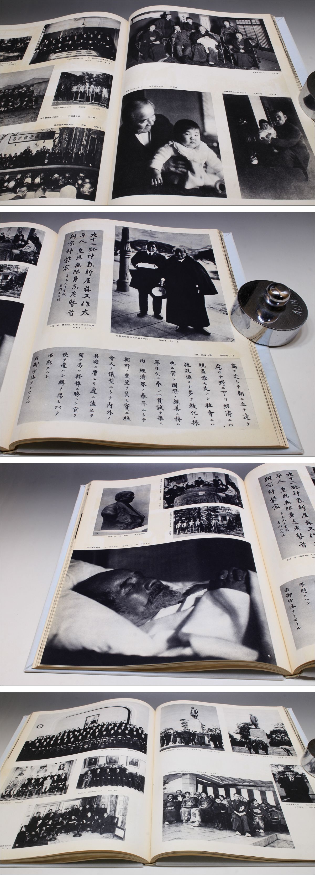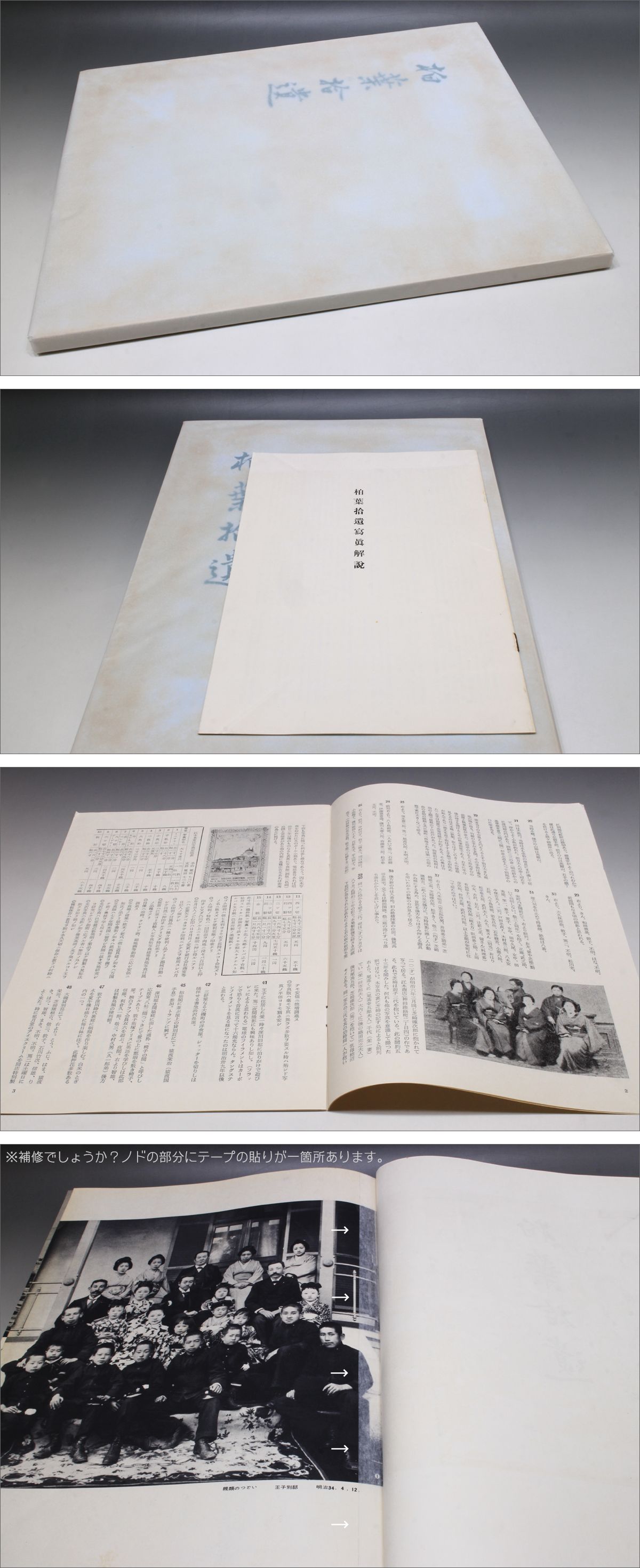 柏葉拾遺 縦35.6cm × 横26cm × 厚さ1.5cm、115ページ、大型本 別冊 柏葉拾遺写真解説 17ページ 昭和31年刊行、渋沢栄一の嫡孫、渋沢敬三の還暦を記念して出版された写真集です。 敬三を中心とした渋沢子爵家の人々や財界人、政治家、文化人など482点の写真図版を収録します。 著名な人物の写真も多く収録されており非常に貴重な歴史写真集だと思います。 [本の状態] 表紙にかけてヤケでの退色・シミ汚れ。 内部ページは内部余白にかけてヤケでの退色やシミ汚れ。 第1ページのノドの部分に補修と思われるテープ貼りがあります。 表紙に掛けられたグラシン紙は新しく交換されているようです。 ■発行日: 昭和31年(1956年) 8月25日 発行 非売品 ■編集・発行人: 中山正則 ■発行所: 柏窓会 ※大型本のため、ゆうパケットやレターパックの規格に収まらず、ゆうパックでの発送となりますので、予めご理解の上、ご検討お願いいたします。 [発送方法] (1) ゆうパック(おてがる版) 80サイズ ・ 保険あり(実損額上限30万円まで) ・ 下記の時間帯で指定が可能です。 午前中・12時~14時・14時~16時・16時~18時・18時~20時・19時~21時・20時~21時 https://auctions.yahoo.co.jp/topic/promo/post/guide/price.html ・ 複数商品を落札いただいた場合は同梱いたします。 (同梱の場合、上記の送料と異なる場合があります。「まとめて取引」のご選択お願いいたします。改めて同梱送料を計算しお知らせいたします。) |