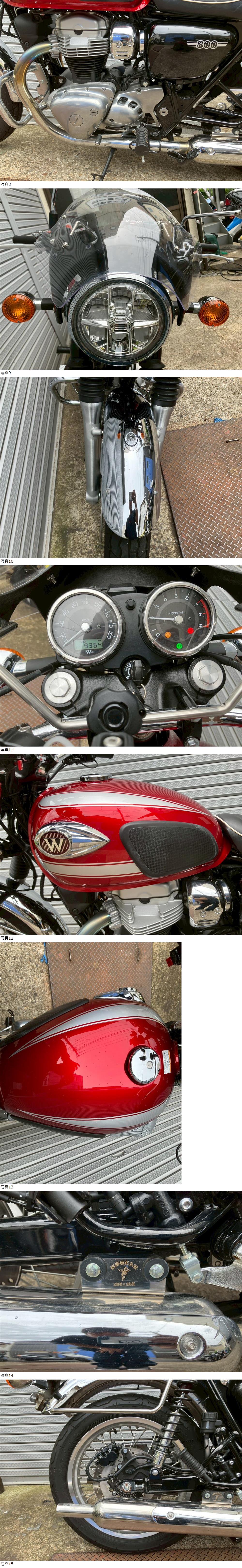 | 商品説明 | この度は当出品車両をご覧頂きまして誠に有難う御座います。 他にも複数台出品がございますので宜しければご覧ください! ご入札頂けた際には文末にありますお取引詳細にご同意頂けたものとさせて頂きます。 下記車両詳細・お取引詳細になりますので必ずご一読くださいませ! また、直接お越しいただいた方にその場で販売することもあるため予告なしに出品の取り消し等をする場合も御座います。 よって、落札前には一言コメント欄にてご一報頂けますと幸いです。予めご了承下さい。 〜〜車両詳細〜〜 メーカー:カワサキ 車種:W800 年式:2022年式 色:赤 鍵:純正キー2本 排気量:800cc 走行距離:9,363km 燃料供給装置:インジェクション フレームNo:EJ800A-006XXX 車検:なし エンジンガード&アールズギアフルエキマフラーつきのW800入荷いたしました☆ ・外観 目立つ傷割れはなく好印象な1台です。 状態は写真にてご確認ください。 アールズギアワイバンクラシックフルエキ、エンジンガード、フロントスクリーンがついております☆ ・エンジンセルにて始動O K! 吹け上がり良好! 確認箇所は以下となります。 スピードメーター:作動OK! ヘッドライト:ハイロー点灯! ウィンカー:前後左右点灯! テール:尾灯・ブレーキ共に点灯! ナンバー灯:点灯! ホーン:作動OK! ★別途部品交換受け付けます! ・タイヤ前後交換など!詳細は直接お問い合わせくださいませ! エンジンオイル・タイヤ交換など! 詳細は直接お問い合わせくださいませ! *上記ご利用の際は部品の在庫状況によりお引き渡しまでにお時間を頂戴する場合が御座います。 〜〜お取引詳細〜〜 ※ご注意ください※ 出品車両はあくまで現状販売となります。走行点検などは行っておりません。 良好・好印象などの表記に関しても車両の状態を確実に保証するものではなく 細かい程度の差なども含めあくまで当方の主観でありますこと重々ご承知置き下さい。 特別に気になる箇所など(外観に限ります)がある場合は直接ご相談ください。 ご指定いただきました箇所のお写真を添付をさせていただきます。 (あまりにも多い場合はご対応致しかねます。) 上記を踏まえまして現車の確認は大歓迎です。 細かい箇所など気になる方は是非とも現車確認を行ってください! (予約制となりますので直接お問い合わせください。) 一般の二輪販売店と同様の点検・整備は行っておりません。 車両に関する一切の保証等も御座いませんので自走でのお引き取りはお断り致します。 ある程度の知識があり落札後にご自身で整備の出来る方、或いは整備工場等にて分解整備を別途検討できる方、メンテナンスベースとしての使用などの落札を推奨しております。 明記してあること以外の確認はしておらず、また致しかねます。 目視できる消耗品以外のパーツに関しましても寿命のわからぬものなど御座います。 (中古品ですのでつい先程まで正常に作動していたにも関わらずお受け取りの際に状態の変化などある場合も十分御座います。例・電子機器、ワイヤー類など) 再三にはなりますが如何なる場合もお引き渡し後のキャンセル・クレームはお受け致しかねます。 現状販売というものを重々ご理解の上ノークレーム・ノーリターンでよろしくお願い致します。 原則キャンセルはお受け致しかねますが、止むを得ず落札者様都合でキャンセルされる場合には 落札金額の1割をキャンセル費用として頂戴させて頂きます。 上記取引内容に不安を感じられる方には二輪販売店等の整備・保証付き車両のご購入を強くお勧め致します。 ★直接引き取り・即引き取り大歓迎! 直接引き取りの場合、落札から1週間以内にお引き取り下さい。 それ以降日割りにて2,200円を別途頂戴させて頂きます。 *部品交換をご依頼の方は完成のご連絡から1週間以内となります。 ★配送OK! 主に配送業者に委託しております。ご自身で手配いただいても結構です。 レッドラインの金額を参考にしておりますのでお手数ですが費用に関しましては落札者様にて直接HPでご確認下さい。 発送元は埼玉県川口市となります。ご購入から配送までの目安は関東近郊で1〜2週間程度となるかと思います。(地域、期間により大幅に異なりますので納期が気になる方は直接レッドラインへお問い合わせ下さい。) 関東近郊の場合割増でお早めにお届けできる場合も御座いますので一度ご相談下さいませ!(対象外となる場合も御座います。) また、配送の場合もお取置き等の対応は致しかねますので落札後は速やかに配送依頼の手続きを行わせて頂きます。 ★車両のみの販売となりますので必要な場合のみ別途5,500円にて販売証明書の発行・発送を受け賜ります! ★新規アカウントの方、落札者様の評価内容によりましては、ご入札頂いても当方の判断で削除する場合がございます。予めご了承下さい。 ★落札後、24時間以内にお客様情報のご入力・落札代金のお支払いがいただけない方のお取引はキャンセルとさせていただきます。(お支払いに関しま