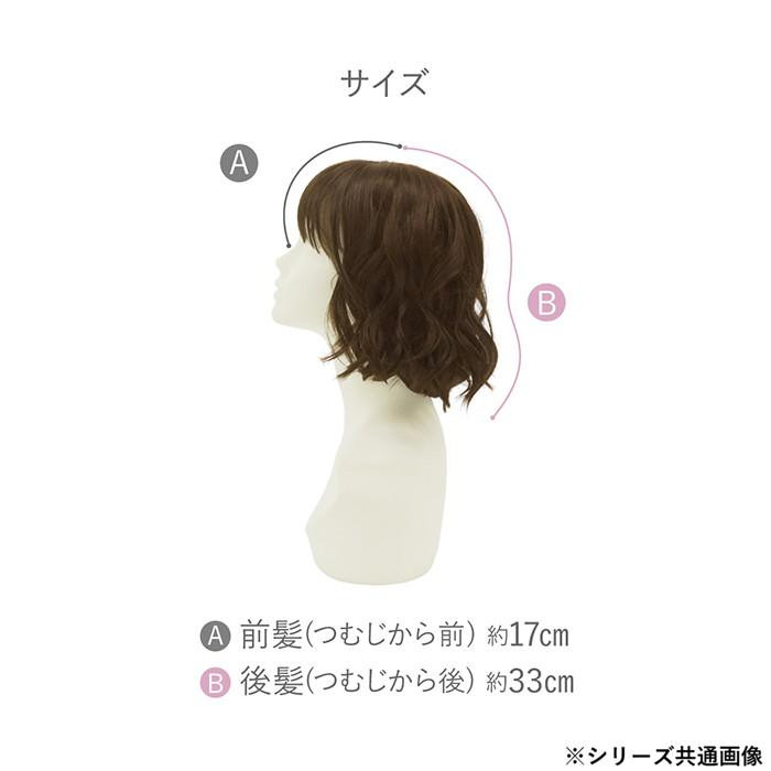 | サイズ | つむじから前:約17cm、つむじから後:約33cm、キャップサイズは既存の帽子ウィッグより小さめ(キャップ周り約-5cm、フロントからバックまで約-2cm、耳-トップ-耳まで約-2cm) 個装サイズ:13.0×21.0×7.0cm |