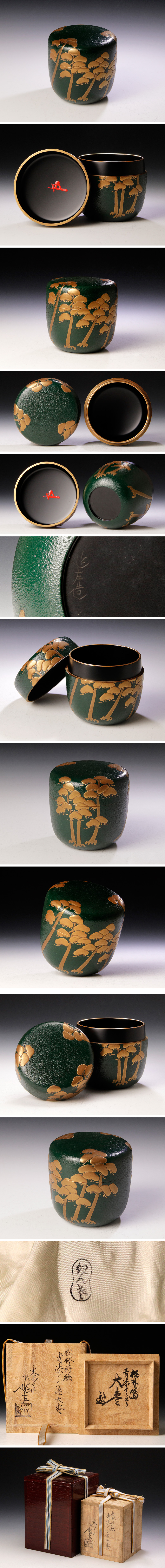 | 【古美味】六代川端近左『鵬雲斎書付』松林蒔絵 青漆イジ塗 大棗 茶道具 保証品 |