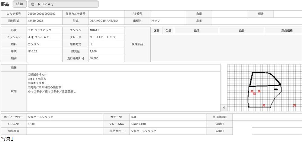 H18年 KGC10 パッソ カラー:S28 左 リアドア /送料 L/905303 收藏