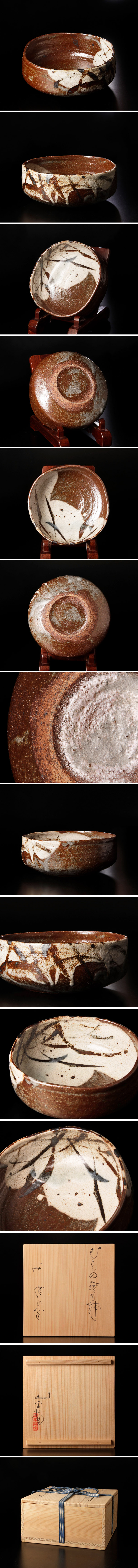 三重県の廣永窯(ひろなががま)で作陶した日本の陶芸家。「最後の茶人陶工」とも称された川喜田半泥子の愛弟子として知られ、その精神を受け継ぎ、半泥子没後も約五十年にわたり仙鶴窯(旧 廣永窯)の火を守り続けました。赤絵・色絵・染付を中心に制作し、無所属作家として個展のみで作品を発表。公募展には一切出品していません。 今作は、わずかに揺らぎを含んだ円が温もりを感じさせる鉢。胴と見込みに描かれた草模様は、風にそよぐ気配を帯び、静かな動きを宿します。素朴さの中にやわらかな詩情が漂う、味わい深い一作です。 ★商品は坪島土平の作品である事を保証致します。 |