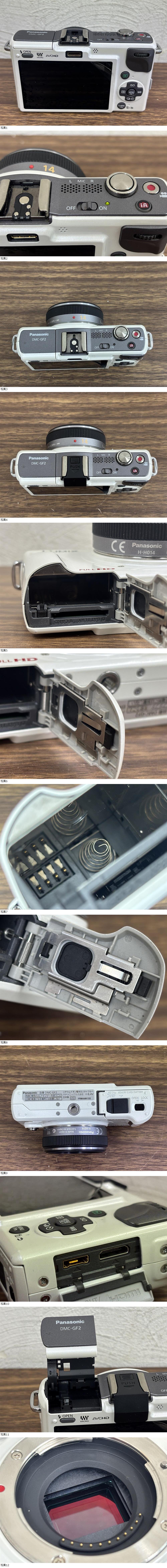 出品の商品は 21661★Panasonic パナソニック LUMIX デジタル一眼カメラ ミラーレスカメラ DMC-GF2 レンズ H-H014 G 1:2.5/14 ASPH Φ46 0.18m/0.59ft-∞ になります。 出品詳細を最後まで読んで頂き、入札をご検討下さい。 ・画像で詳細・状態をご確認ください。 ・頂き物です。 ・長期間自宅保管品です。 ・使用していた中古品です。 ・多少の小傷や汚れがあります。 ・簡易的な動作確認済みです。 ※実際の撮影確認や、詳細な使用確認、動作確認はしていません。 ・フィルムが一部剥がれています。 ・フィルム部分に傷みがあります。 ※黒いモヤのようなものが全体的にあります。 ・レンズに傷や汚れはありません。 ・バッテリーの充電可能です。 ・動作の保証は出来ません。 ・全て現状品渡しになります。 ・ご確認したい点があれば、質問よりご連絡ください。 専門知識が必要なご質問にはお答え出来ない事もありますが、可能な限りご返答させて頂きます。 ・画像が全てとなりますので掲載画像をご覧の上ご判断頂きご入札をお願い致します。 | ||||