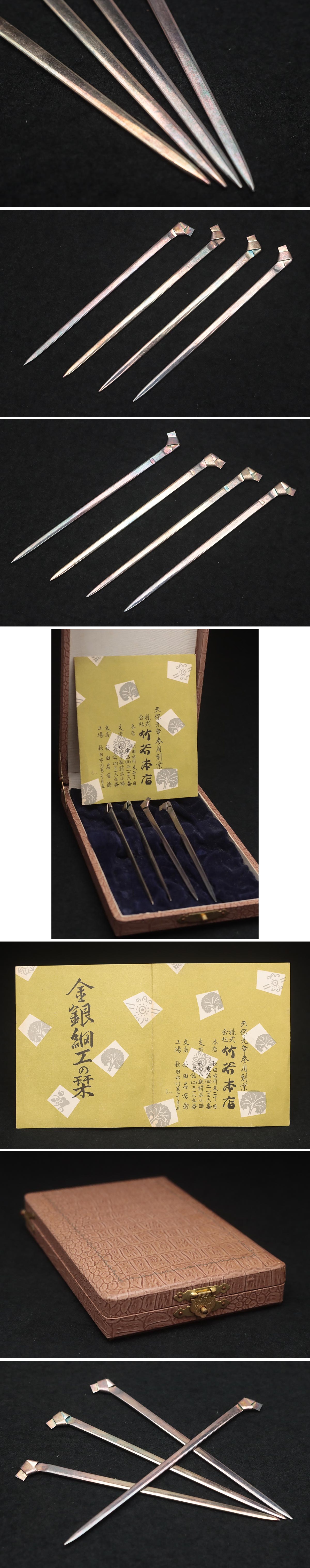 FF264 竹本本店 茶道具 純銀製 利休結び 菓子切り 四本 純銀刻 ケース付・純銀楊枝・和楊枝 收藏
