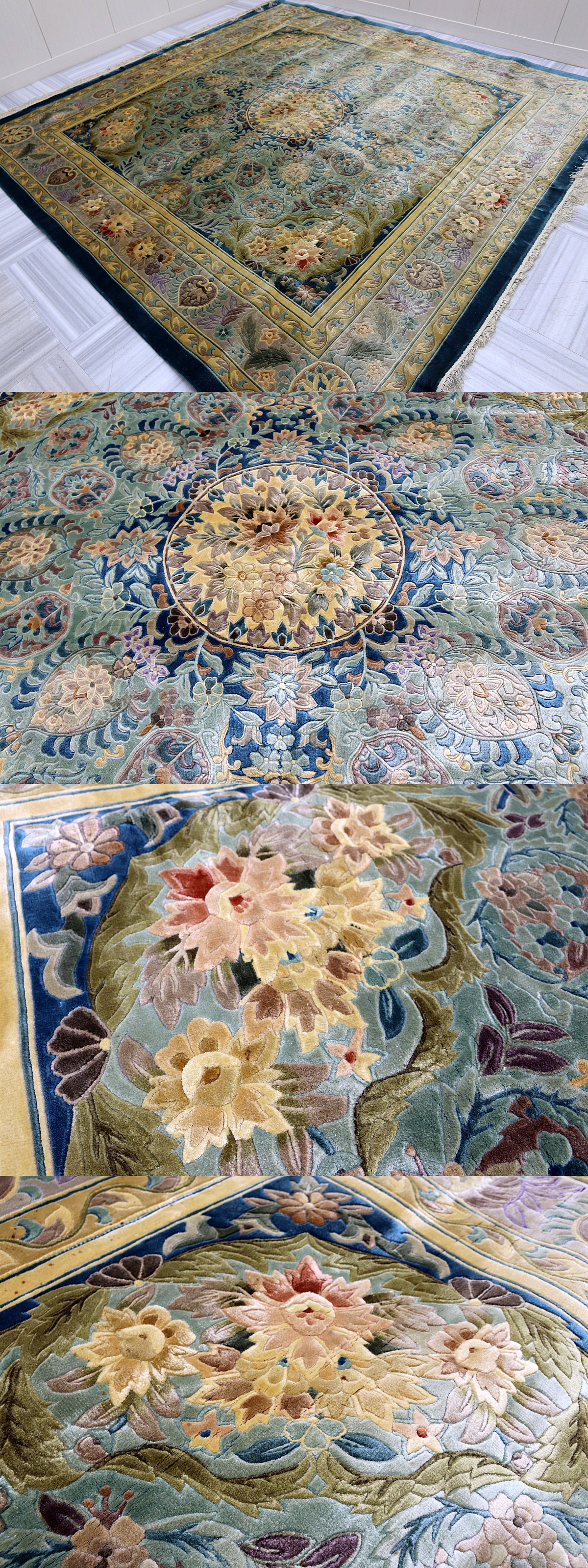 | ★ご覧いただき誠にありがとうございます★ ◆サイズ:約-240×240cm(フリンジ含まず)手織りの為、左右で多少の誤差はございます。 ◆中国段通◆シルク 手織り絨毯の出品です。古来、数千年前より「幸福」や「長寿」といった人々の願いを込めて一つ一つ丁寧に丹念に仕上げられた、中国伝統の工芸品です。世界三大絨毯(ペルシャ絨緞・段通・トルコ絨緞)の一つに挙げられ、その光沢と織り目の密度の高さには定評があります。シルク100%で織り上げている為、手触りは柔らかくそのしなやかで繊細な品質は他を圧倒するほどの出来映えです。シルク絨毯は角度によって色合いは薄く見えたり、濃く見えたりしますのでウール絨毯とは全くの別物です。手触りも柔らかく最高の質感を与えてくれます。一つ一つを手織で編み上げる、時間と労力を無視した工法は、良いものを作る信念が無ければなせない業です。手織り絨毯は、その織り特性や素材の特性からみても非常に耐久性があります。年月と共にますますその風合いの良さが醸し出されることでしょう。 ◆最高峰-中国段通より、絹100%の手織り絨毯の出品です。花や草食が細かく織られた逸品です! 写真、所々白く光って見えるのは絹が光で反射しているからです。見る角度によって色合いが違って見えるのは、シルク絨毯の特徴でもあります。 段通は、元々はペルシア(現在のイラン)などで作られていた敷物で、シルクロードを通って中国に伝わったとされています。中国緞通が盛んに織られるようになったのは、明朝時代の頃から日本でいうと室町時代から戦国時代を経て江戸時代に入るころになります。 ・状態~全体的に悪くないですが一部にシミがございます。※写真赤丸の範囲に醤油か何かが飛び散ったような小さいシミが多数確認できます。要写真参照願います。以上、最高級シルク段通をご検討下さい! ※商品は折りたたんで発送しますので折り目が付きます事をご了承ください。 ●あとはすべて写真にてご審査願います。写真には写りきらない、よごれやダメージ、詳細部分の、記載ミスなどがもしあっても、その旨のクレームはご勘弁下さい。上記内容をご理解頂き、ノークレーム・ノーリターンでお願いいたしいます。 |