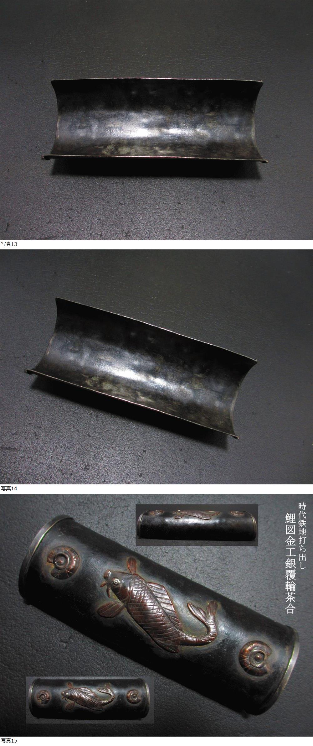 時代鉄地打ち出し 鯉図銀覆輪金工象嵌茶合 茶則 茶量 仙媒 煎茶道具 商品寸法: 高さ3cm、縦径13.5cm、横径5.2cm 收藏