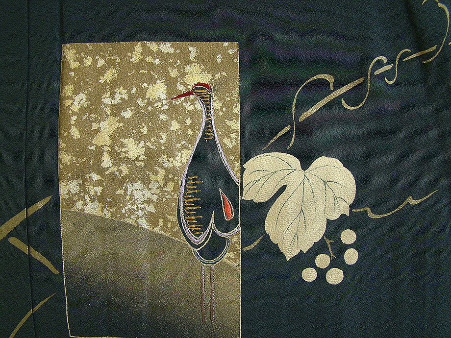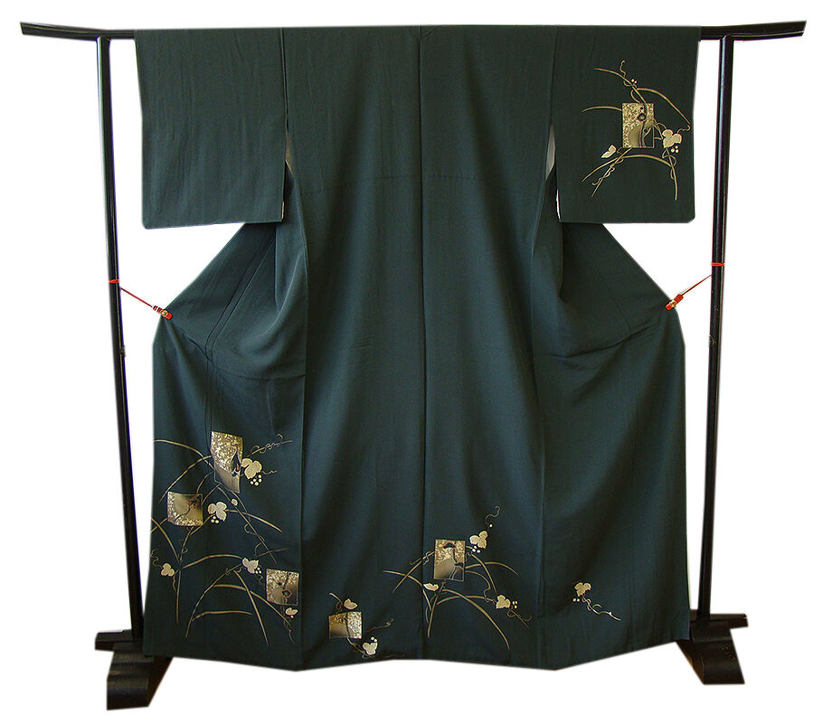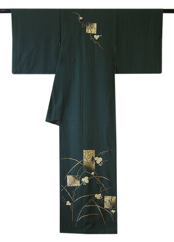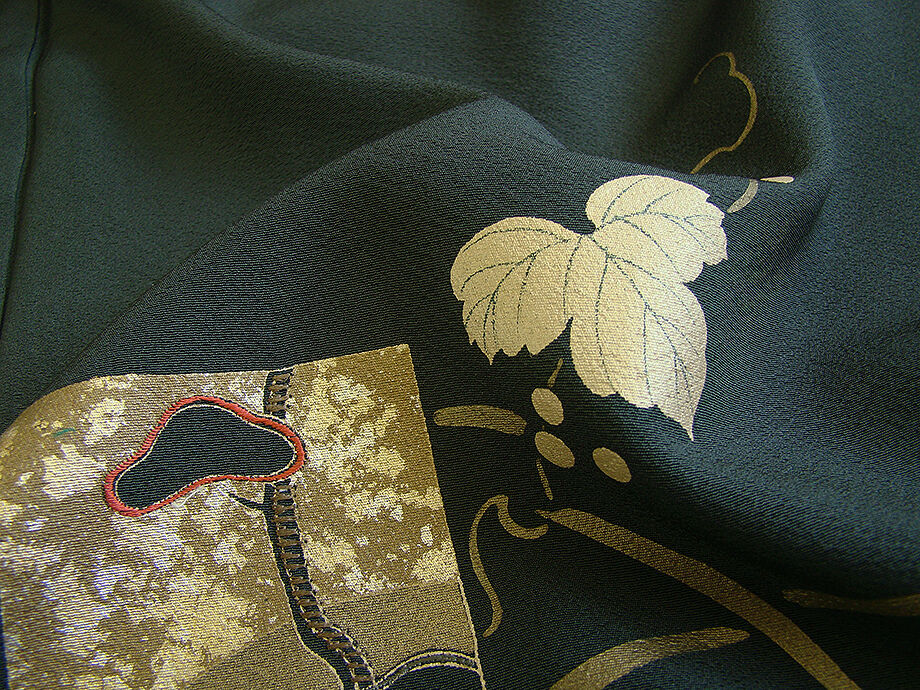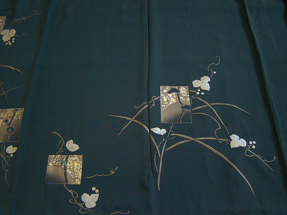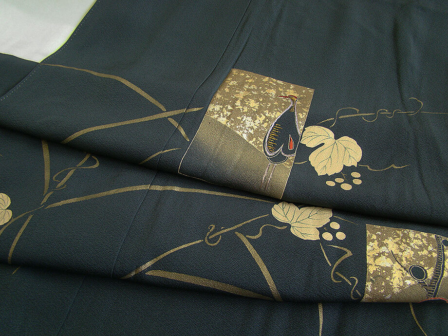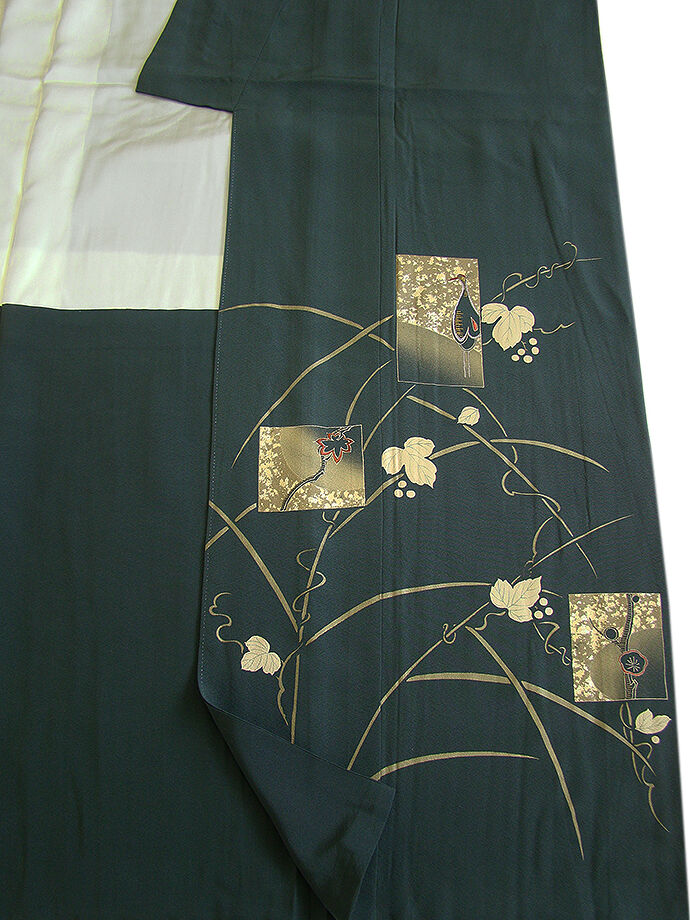 | 商品説明 | こちらのお品は「袷」ですので10月から5月までお召頂ければと思います。 とてもしなやかで柔らかな手触りの着心地良い重めの極上ちりめん地の生地、 渋い黒緑色地に色紙文に松竹梅、蔦、鳥文の染柄に金彩加工仕立てに刺繍入り、 気品に満ち溢れた彩りが正統派のお着物として一枚は欲しい逸品の素敵なお着物です。 八掛は共色に柄入り(正絹)、幅広い年代の方にお召頂けます。 |