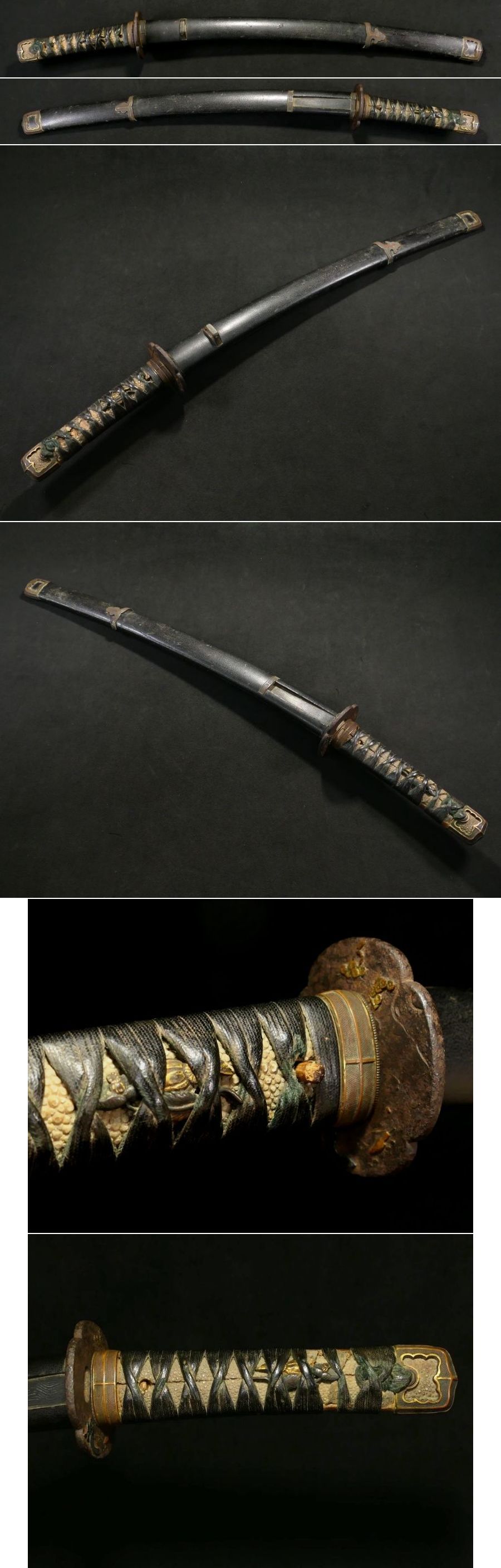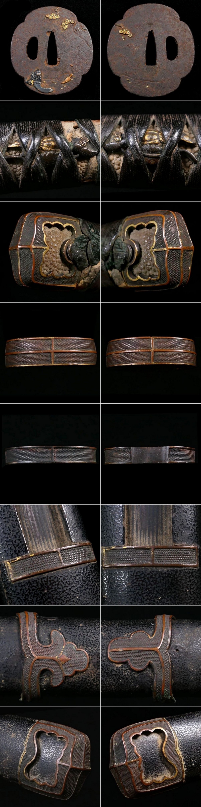 | 商品説明 | 材質:(縁頭・鯉口・責金物・瓦金・鐺) 赤銅魚々子地 (鍔) 鉄地 (目貫) 赤銅地 ウブ太刀拵え 揃い金工金具が付いた拵えのご紹介です。 縁頭・鯉口・責金物・瓦金・鐺は赤銅魚々子地の 揃い金具となっております。 鍔は筆を走らせる歌人と思われる人物の図が施された 雰囲気良き一品です。 目貫は瓜の図が施されており、状態などから 古金工のようにも見えます。 詳しい方、画像にてご判断下さい。 飾り映えのする一品と存じます。 この機会に手に入れて下さい。 状態は画像の通りとなります。 鞘の表面にヒビや小傷が見られますが 十分お使い頂けると思います。 その他、古い物ですので多少の時代傷みはご理解下さい。 詳しい状態等は画像にてご判断下さい。 |
