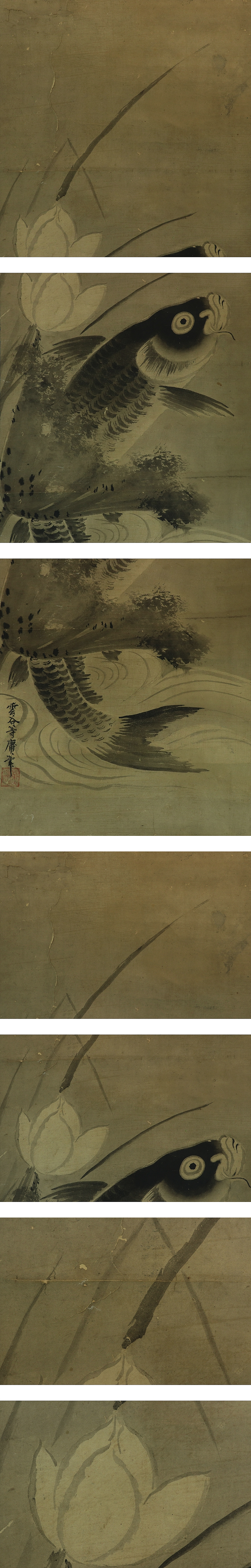 古画 ・雲谷等庸銘【蓮に跳鯉】 本紙は、染み、汚れ、強い折れ、皺、擦れ、虫食、破れ、ヤケがあります。 表装は、染み、皺があります。 【サイズ】 作品 横約39cm×縦約101cm 表装 横約50cm×縦約184cm |