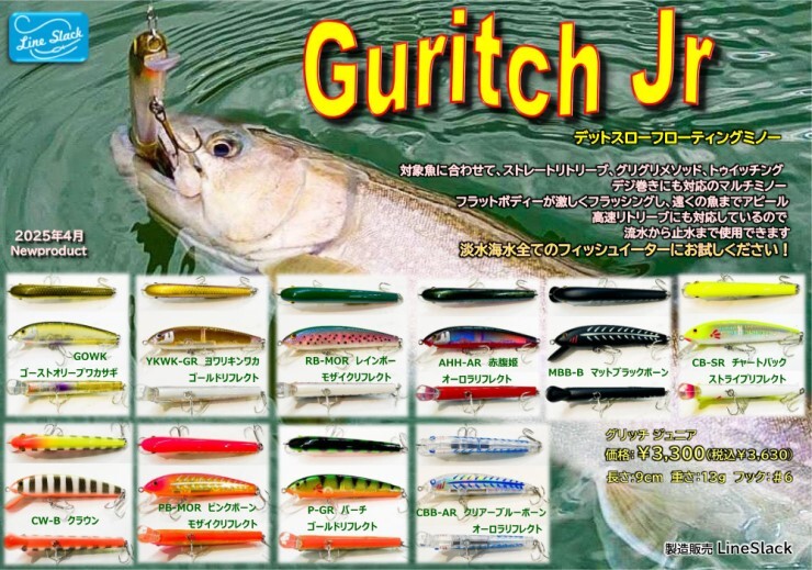 ラインスラック Line Slack グリッチジュニア Guritch Jr デットスローフローティングミノー カラー:RB-MOR レインボー(モザイクリフレクト) 長さ:9cm 重さ:13g フックサイズ:フック#6 Guritchシリーズ共通の特徴ですが、対象魚に合わせて、ストレートリトリーブ、グリグリメソッド、トゥイッチング、デジ巻きにも対応のマルチミノーです。フラットボディーが激しくフラッシングし、遠くの魚までアピール。高速リトリーブにも対応しているので流水から止水まで使用できます。淡水海水全てのフィッシュイーターにお試しください!釣果では、ラージマウスバス、スモールマウスバス、イワナ、サクラマス、ブラウン、レインボー、レイクトラウト、ストライパー、シーバス、トレバリー…どこでも役に立つミノーです。 こちらの商品は店舗、ヤフーショッピング店、店と在庫を共有しているため、時間差で売り切れの場合が御座います。予めご了承下さい。
