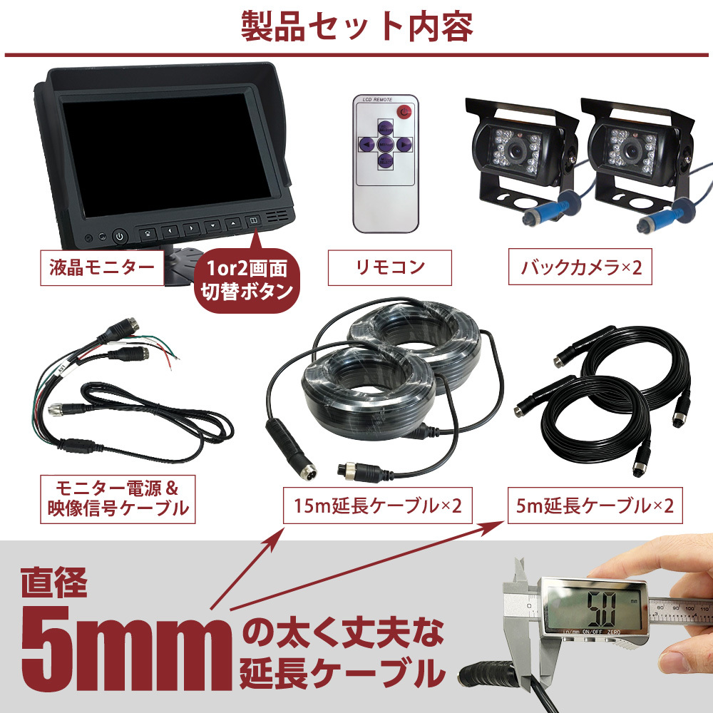 商品名 オンダッシュモニター 7インチ バックカメラ 2個セット 20メートル延長ケーブル 高画質 商品情報 品番:car-125-7i2TY-20M ・高画質7インチトラック バックモニター ・世界基準高防水性能バックカメラ ・赤外線カット機能搭載 ・上下左右反転可能 ・ガイドラインあり/なし設定可能 ・広角:120度(対角) ・映像方式:AHD ■高画質7インチトラック バックモニター IPS液晶モニターを採用し、高画質な映像で確認することができます。 ■赤外線カット機能搭載 夜間のバックライトやスモールランプのわずかな明かりでも綺麗に映り、安全に後方確認をすることができます。 既存の赤外線カットフィルターカメラの撮影映像は一部が変色していましたが、変色しないように改良されています。 ■安心の防塵・防水性能 バックカメラは防水防塵に優れ、高い耐久性と信頼性を誇ります。 ■広角対角120度レンズ 視野角度120度で広域を確認することが可能です。 ■バックギア連動作動時ガイドライン表示ON/OFF設定可能! ガイドラインのON/OFF設定ができ、車庫入れが苦手な方でも楽に駐車することができます。 ■12/24V兼用12Vでも24Vでも使用できるので取付車種の幅が広がります 高画質wsvga 動作電圧:DC 12V/24V 動作温度 -10℃~+65℃(RH95%Max.) ・保証期間1年間 ・製造国:中国 ■商品内容・7インチオンダッシュモニター ・バックカメラ×2 ・操作用リモコン ・15m延長ケーブル×2 ・5m延長ケーブル×2 ・バックカメラ取り付け用ネジ×4 ・モニター用スタンド ・モニター用サンシェード ・モニター電源ケーブル ・取り扱い説明書 ■注意事項 製品に日本語表示システムを搭載しております。同梱しております説明書を熟読してご使用くださいませ。※ご使用の前に付属の取り扱い説明書を熟読し、機器の知識・安全の情報そして注意事項について習熟してから正しくご使用ください。 ※商品改良のため、仕様・外観は予告なく変更する場合があります。また実物は写真と異なる場合がありますので、あらかじめご了承ください。 ※輸送時の擦れや細かなキズがある場合がございます。必ずご理解の上ご購入ください。 ※画像はモニターにより色あいが違って見える場合がございます。また一部イメージ画像を使用しております。あらかじめご了承ください。 ※商品の一部でも加工されている場合、返品・返金には応じられません。 |