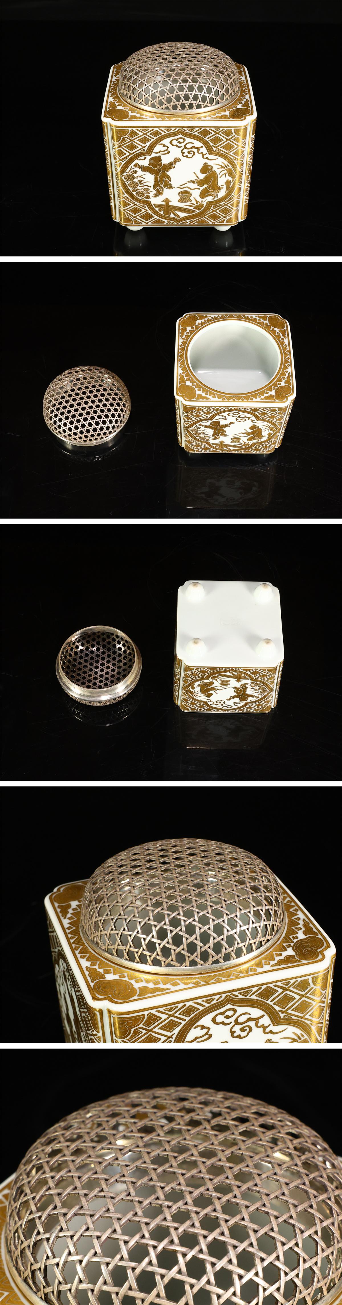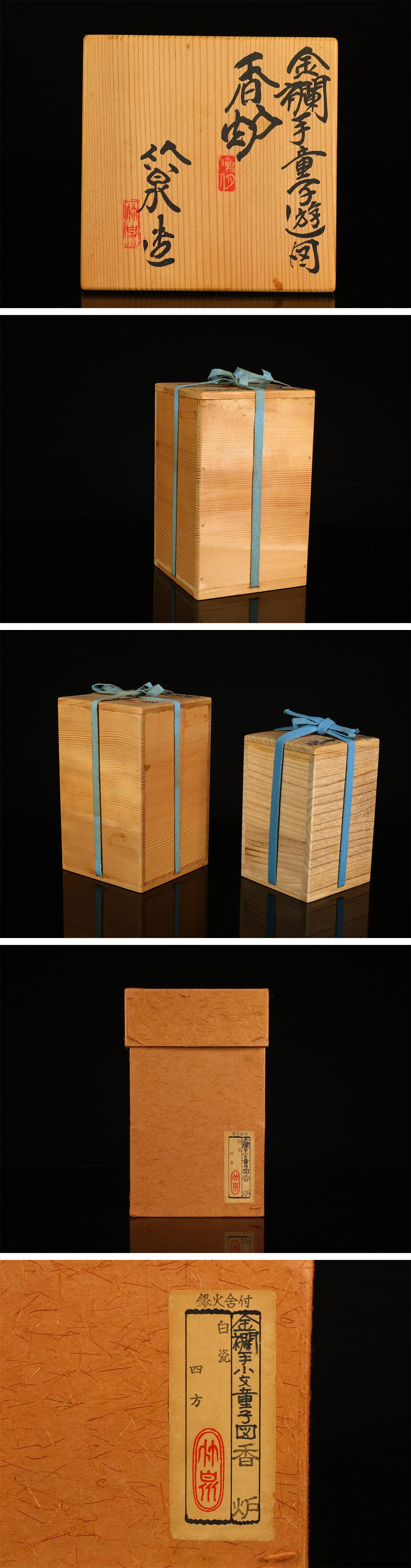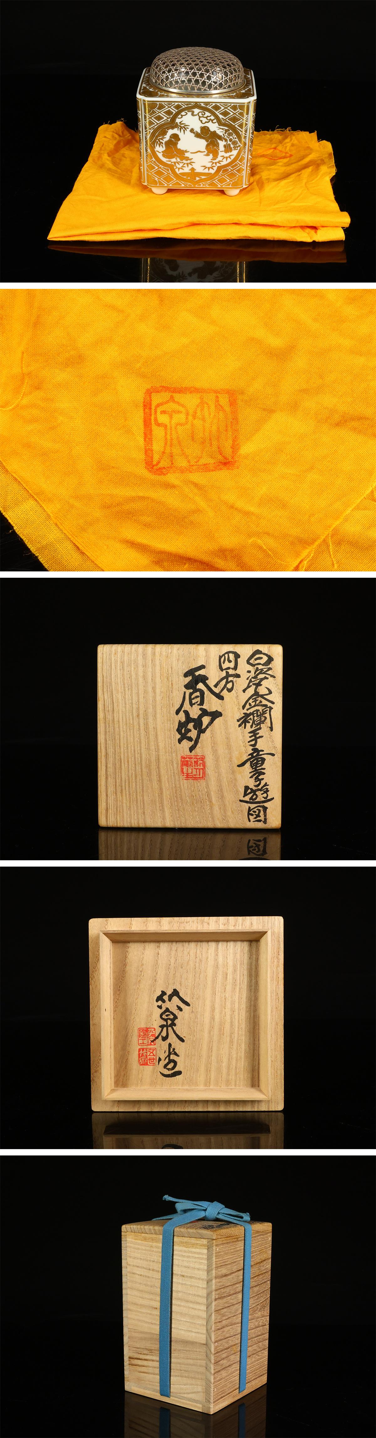 【吉】CM653 【三浦竹泉】 白磁金襴手本金彩童子図 四方 香炉 60g純銀火屋付/三重箱 本物保証品H! 收藏