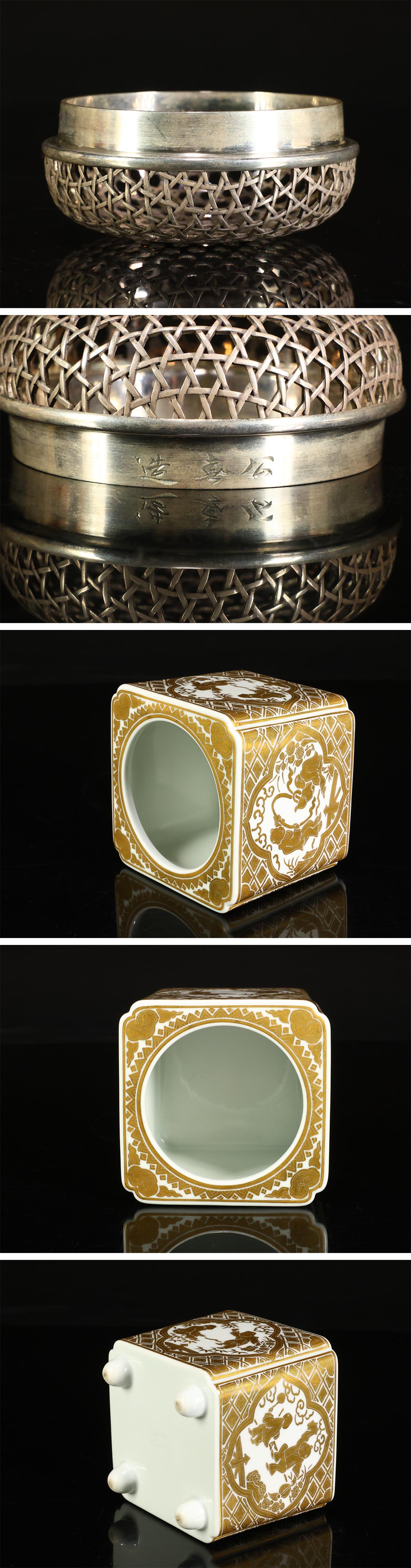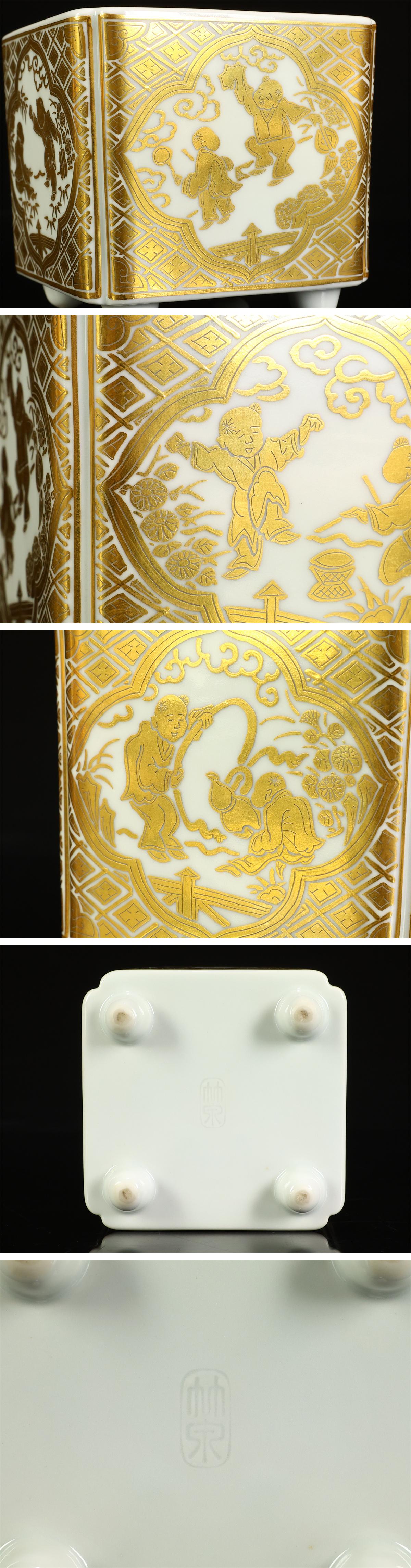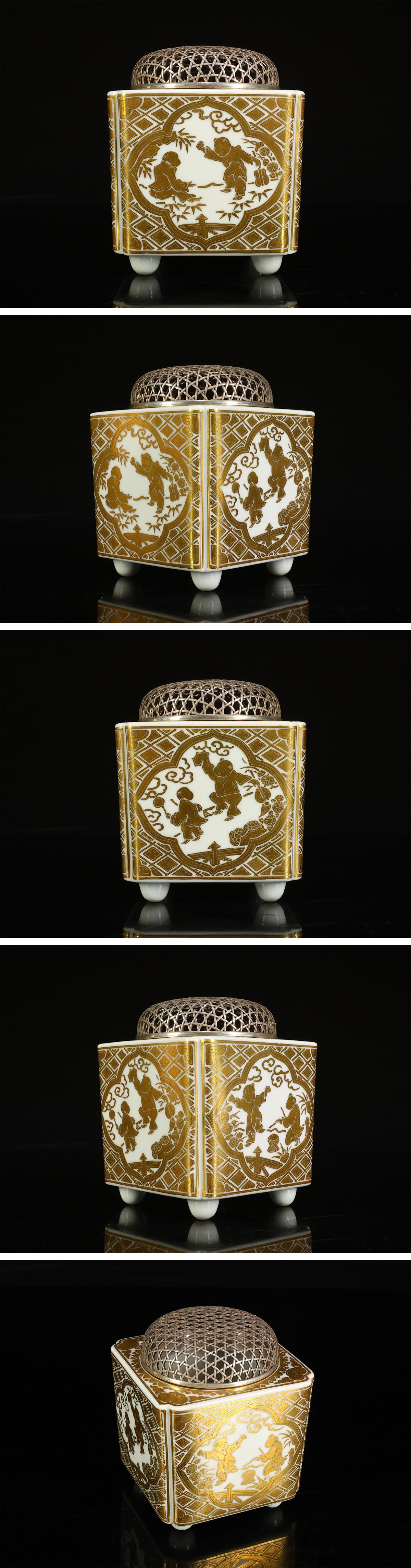 【吉】CM653 【三浦竹泉】 白磁金襴手本金彩童子図 四方 香炉 60g純銀火屋付/三重箱 本物保証品H! 收藏