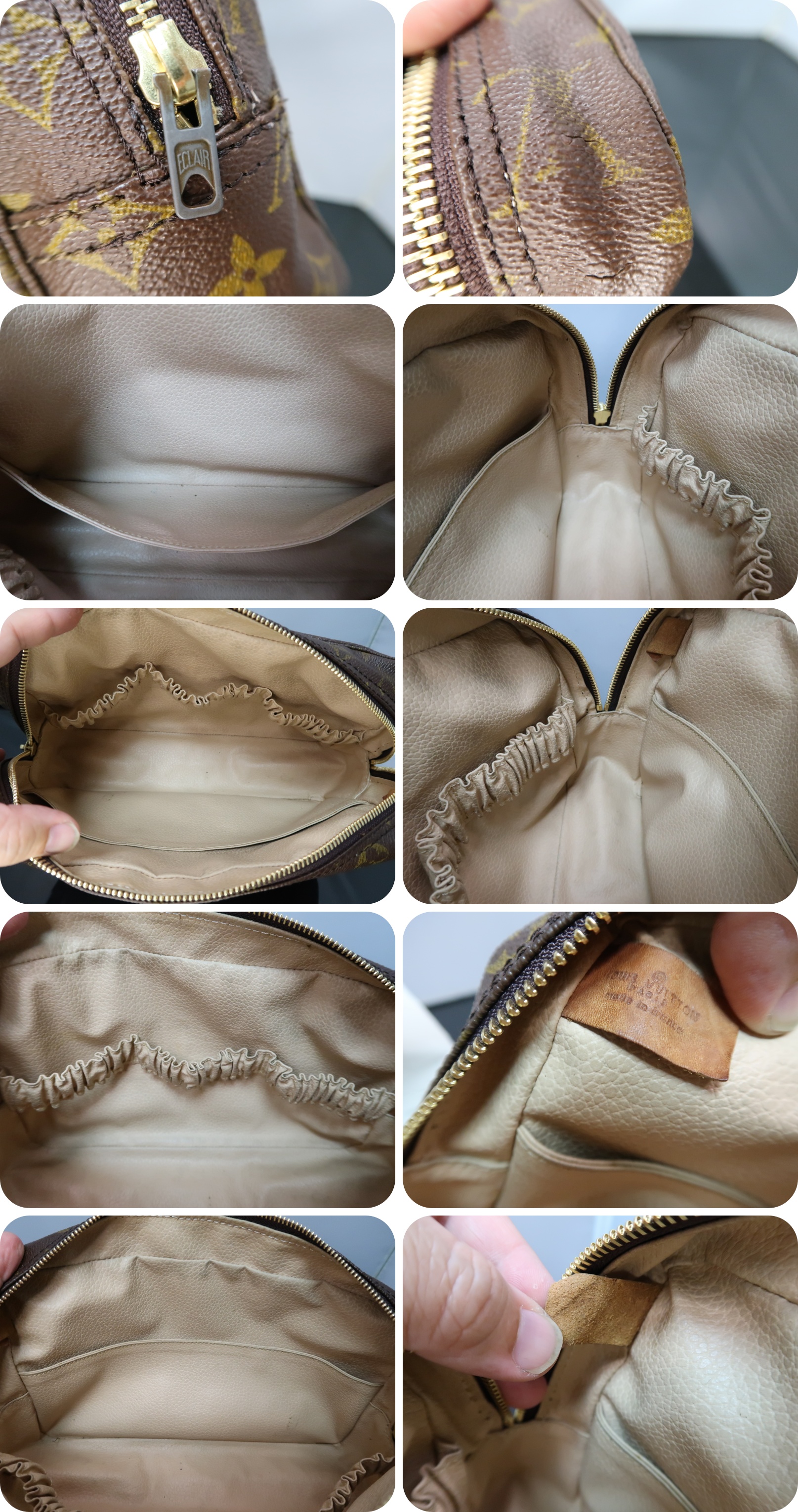 | <外側> | ファスナーのレールの脇のモノグラム生地にひび割れが見られます。 柄も濃く良品です。 ファスナーを私が交換しております。引手は純正です。 |
