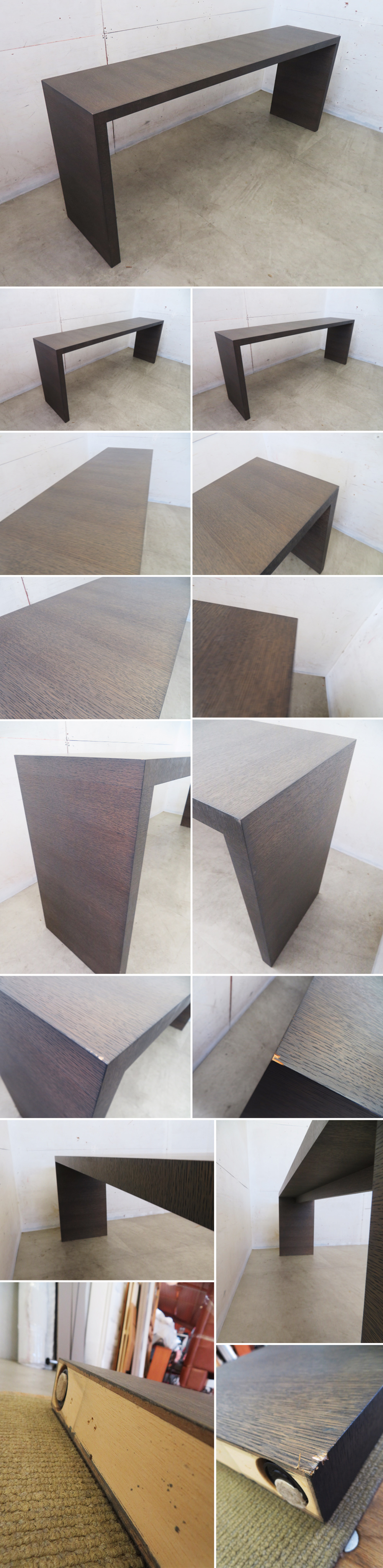 シンプルでモダンなコンソールテーブルのご紹介です。 全て直線で構成されたミニマムでスクエアなデザインが秀逸。 はっきりとした木目が非常に味わい深く、 大人っぽいシックで落ち着いた雰囲気を演出してくれます。 全体的にはとてもシンプルなフォルムです。 天板が広いため、ランプや花瓶等の装飾を華やかに飾ることができます。 ご自宅は勿論、オフィスや店舗などにもオススメ。 アイディア次第で様々な使い方が出来るテーブルですので、この機会に是非!!! コンディション:モデルルーム展示品のため写真のように傷・汚れ等ございますが大きなダメージもなく美品です。 サイズ横200センチ奥行き45センチ高さ80センチです。