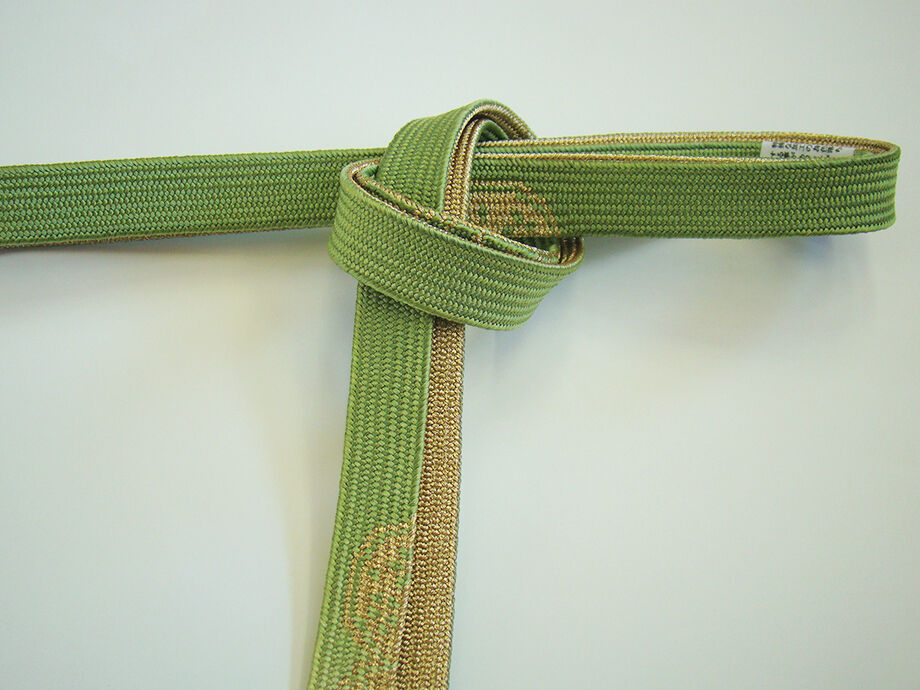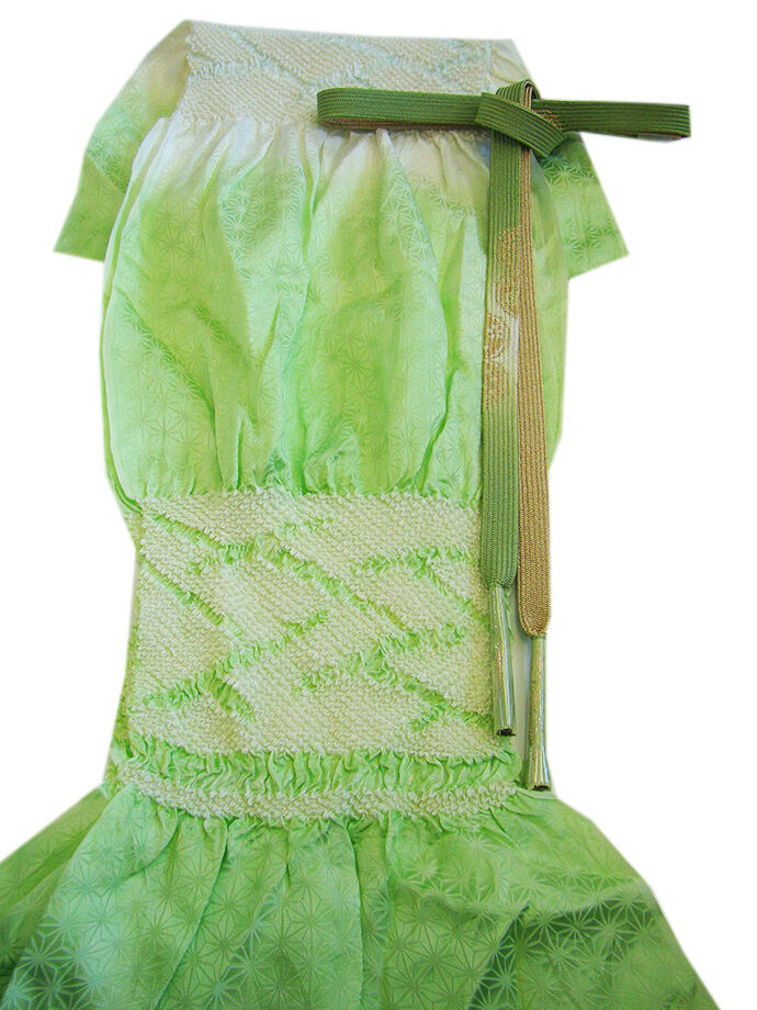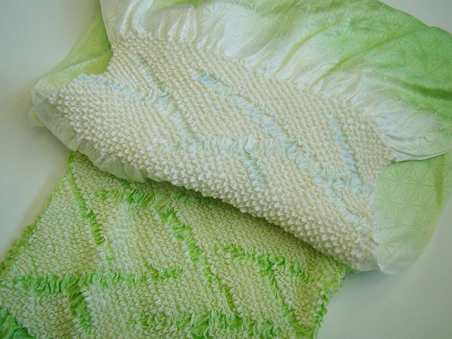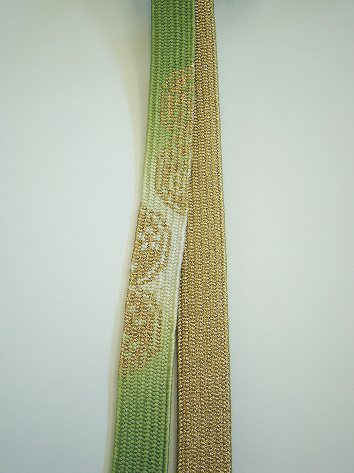 ●帯揚げ: 正絹。 しなやかなさらりとした滑らかなちりめん地、 薄萌葱色地にアイボリー色ぼかしに麻の葉柄の地模様入りに絞り入り。 ●帯〆: 正絹。 平組。 浅緑色地に金糸入りの編み込みの組紐。 長さ160cm 幅1.7cm |