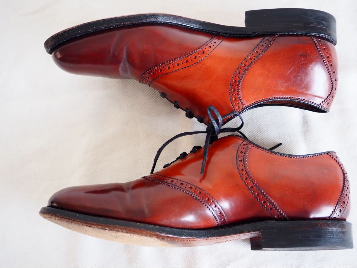 ハノーバーのマスターフレックスラインのコードバンサドルシューズだ。MASTER FLEXラインであるため、1980年代のペアではないかと推定している。当時としては、上級ラインとして販売していたようだ。アッパーのシェルコードバンは厚みがありが使用されており、かなり上質なコードバンである事が伺える。また、カラーリングがバーガンディというより、ウイスキーカラーに近い色合いが非常に印象的だ。また、80年代・90年代のアレンエドモンズのコードバンのペアにも見られ、当時の人気のカラーではないかと考えている。| 出价者 | 信用 | 价格 | 时间 |