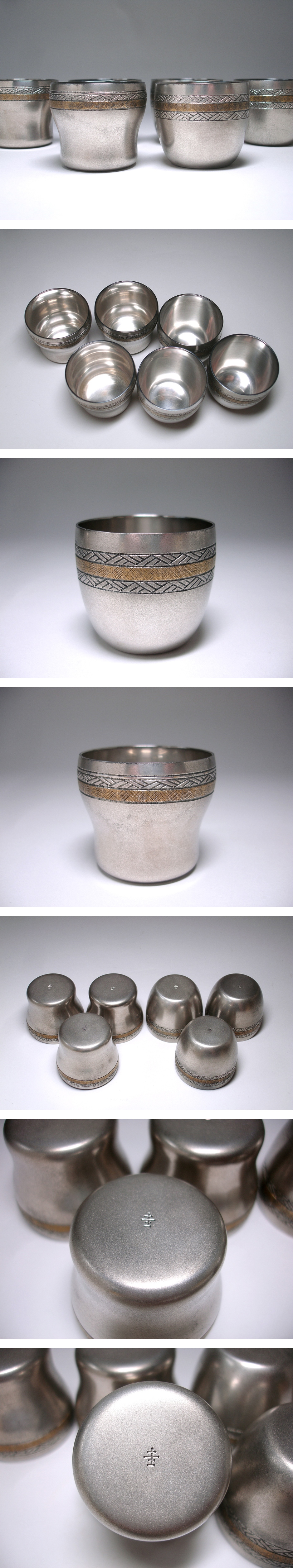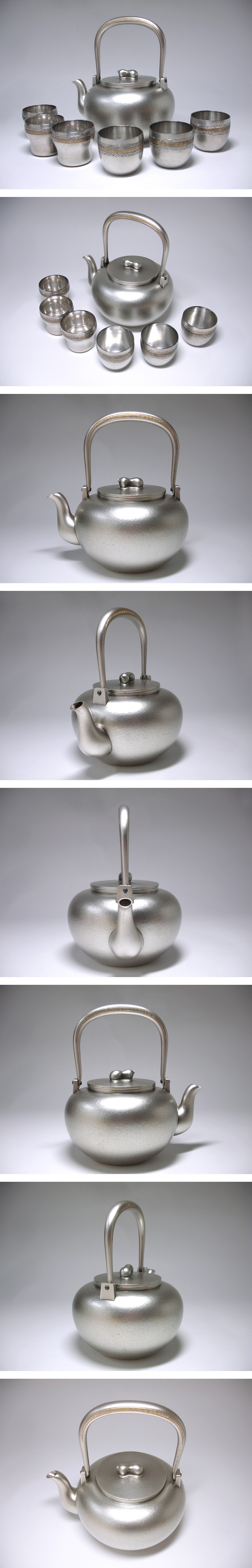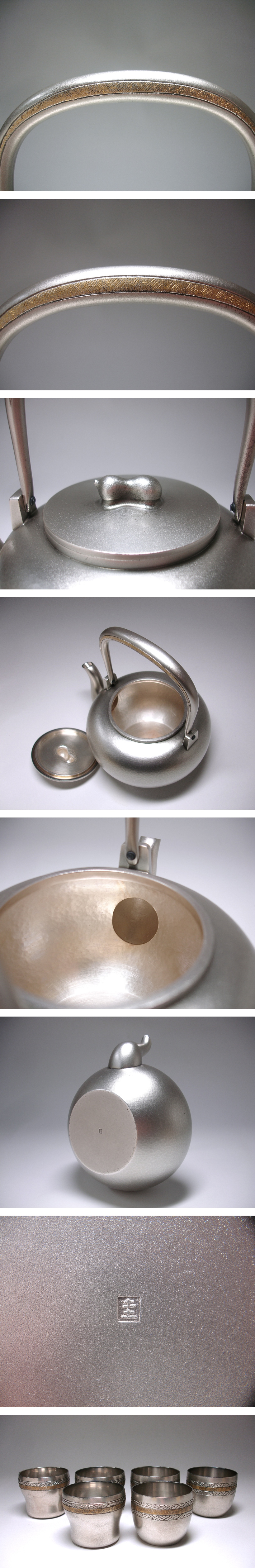 慶應◆近現代彫金家【井伏圭介】作 南鐐 布目金象嵌 煎茶器揃 湯沸・煎茶碗6客 銀瓶煎茶盃 純銀896.5g 收藏