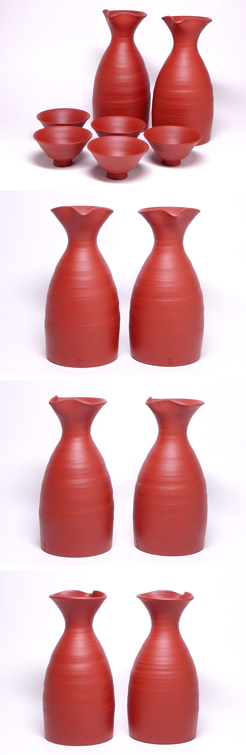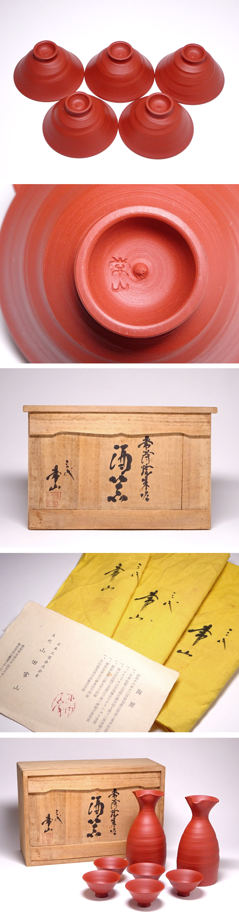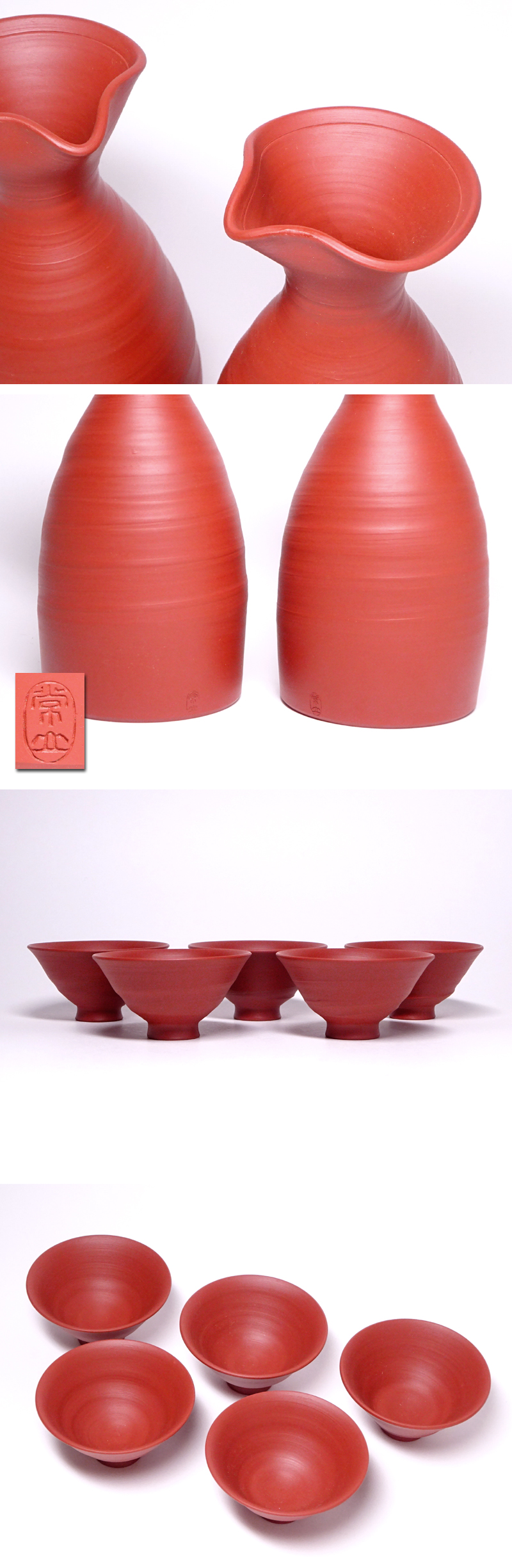 慶應◆人間国宝【三代山田常山】作 常滑焼朱泥酒器揃 徳利一対 猪口五客 共箱付 收藏