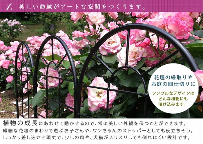 | 清らかでクラシカルなフェンスが植物をやさしく引き立てます。 美しい曲線が庭園にやわらかさを与える、シンプルなデザインのフェンスです。 主役の花を美しく見せる、上品な存在感が魅力です。 どんなグリーンも引き立てますが、薔薇との相性はピカイチです! センスが良く圧迫感のないフェンスは、どんな場所にもマッチして、使いやすさ抜群。 高さ150cmのロータイプは、隣家との境界線に使うと、視線を遮りすぎることなく毎朝のご挨拶もできます。 道路からのちょっとした目隠し&防犯にも役立ちます。 |