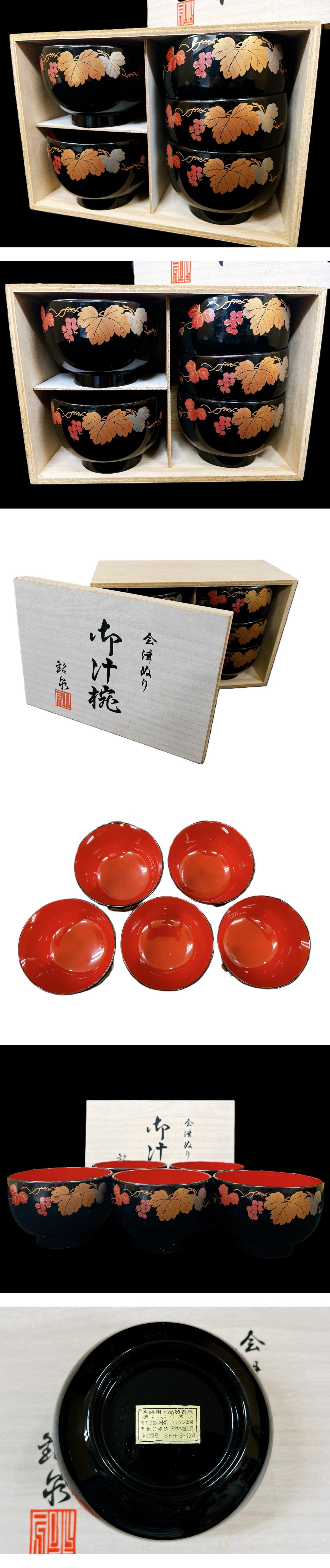 会津ぬり 御汁椀 五客セット 葡萄 木箱入 正月 味噌汁 天然木加工 未使用 和食器 | |