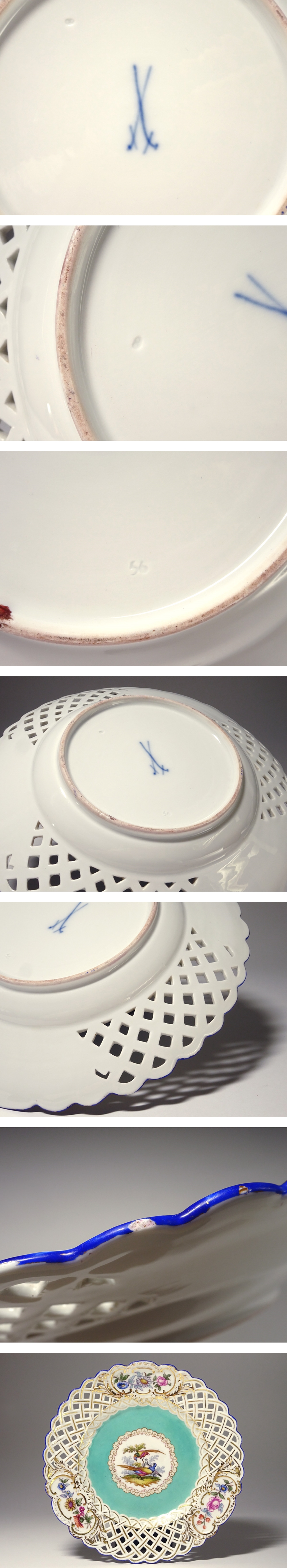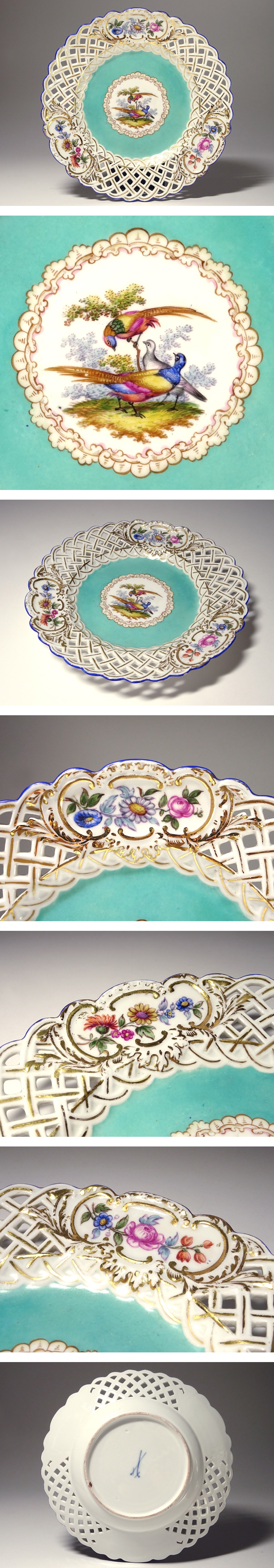 慶應◆19世紀【Meissen オールドマイセン】ハンドペイント花鳥図 金彩透かし装飾飾皿 オープンワーク 直径23.5cm キャビネットプレート