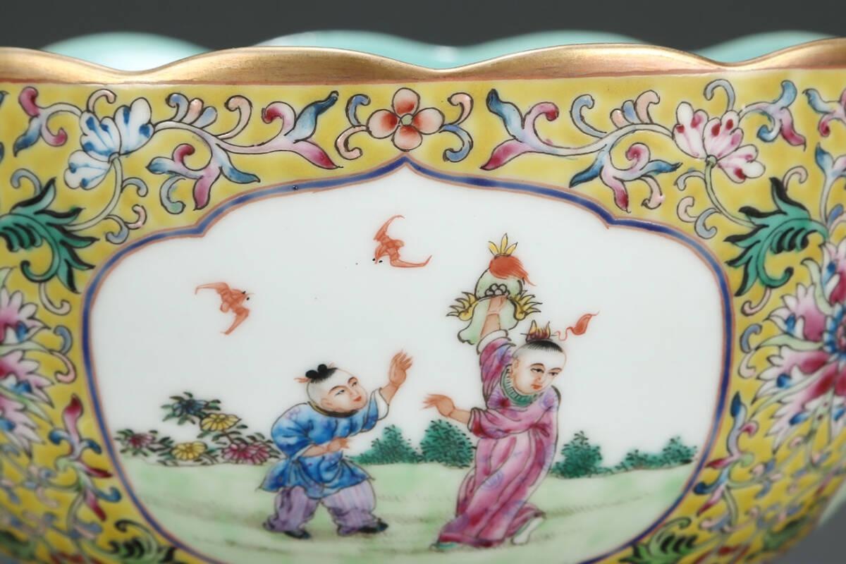 ◆御泓軒◆『清朝時代 陶磁器 大清乾隆年製 粉彩緑地開窗嬰戯図碗・箱付』極細工・古賞物・中国古玩・中国古美術 收藏