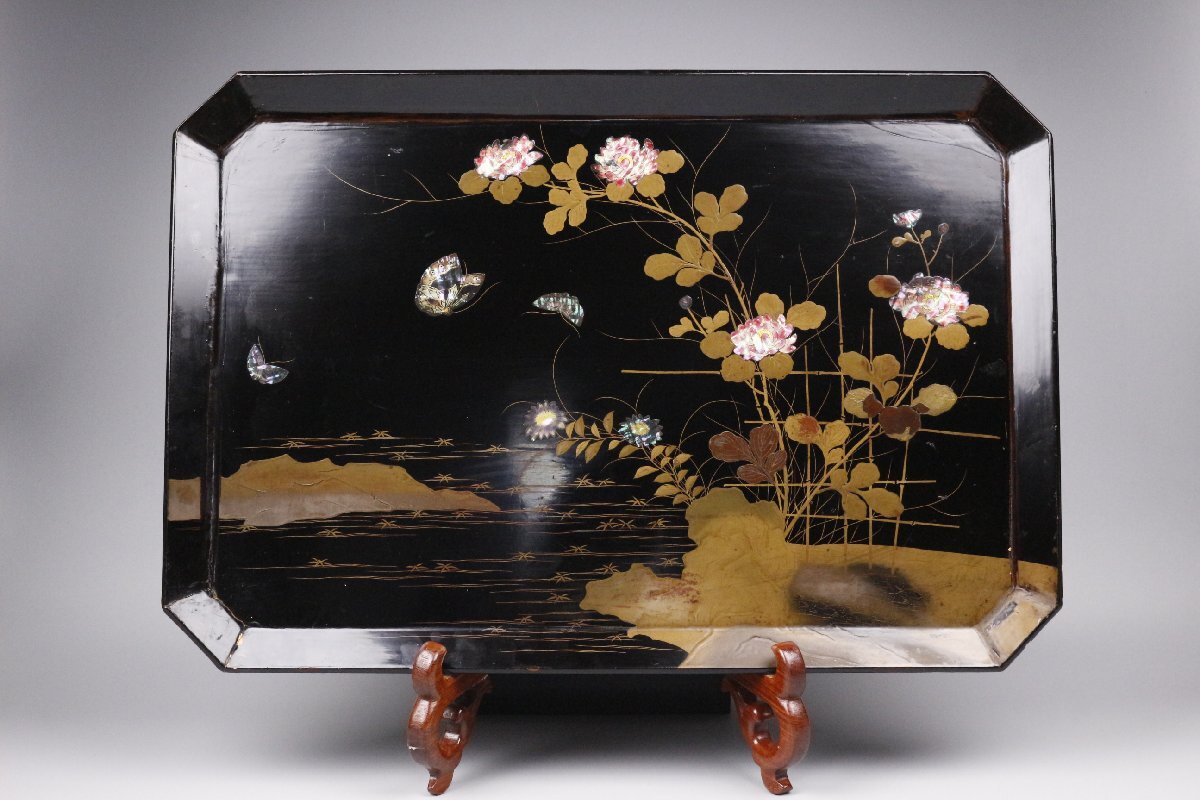 【LIG】長崎螺鈿 金蒔絵 花蝶文長方盆 特大54.5㎝ 古美術品 旧家蔵出品 [.Y]25.10 收藏